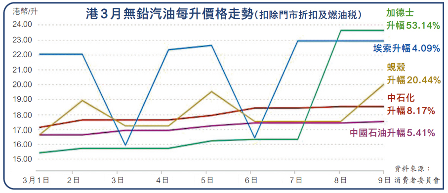 除了影響公共交通工具的費用,油價飆升亦可能影響本地物價,跨境貨運業代表蔣志偉表示,柴油出倉價過去兩周由每公升約4.9元升至約10.6元,營運成本大增,不少運輸公司已向客戶收取暫時性附加費,相信日用品、蔬菜等物價也會被推高。