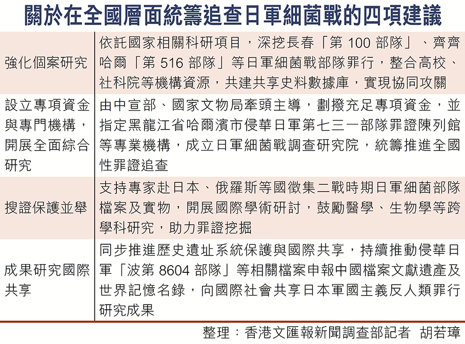 凌友詩在建議中援引多重史料和研究成果表示,以細菌戰的研究領域為例,日軍攻陷香港後立即設立了「香港細菌研究所」,該所負責人成田常次郎在香港曾進行鼠疫病菌研究工作,「但該研究所與廣州的侵華日軍『波第8604』以及731等細菌戰部隊究竟是何隸屬關係、相關實驗數據與具體內容等關鍵細節,仍需粵港兩地專業機構的聯合深入考證。」