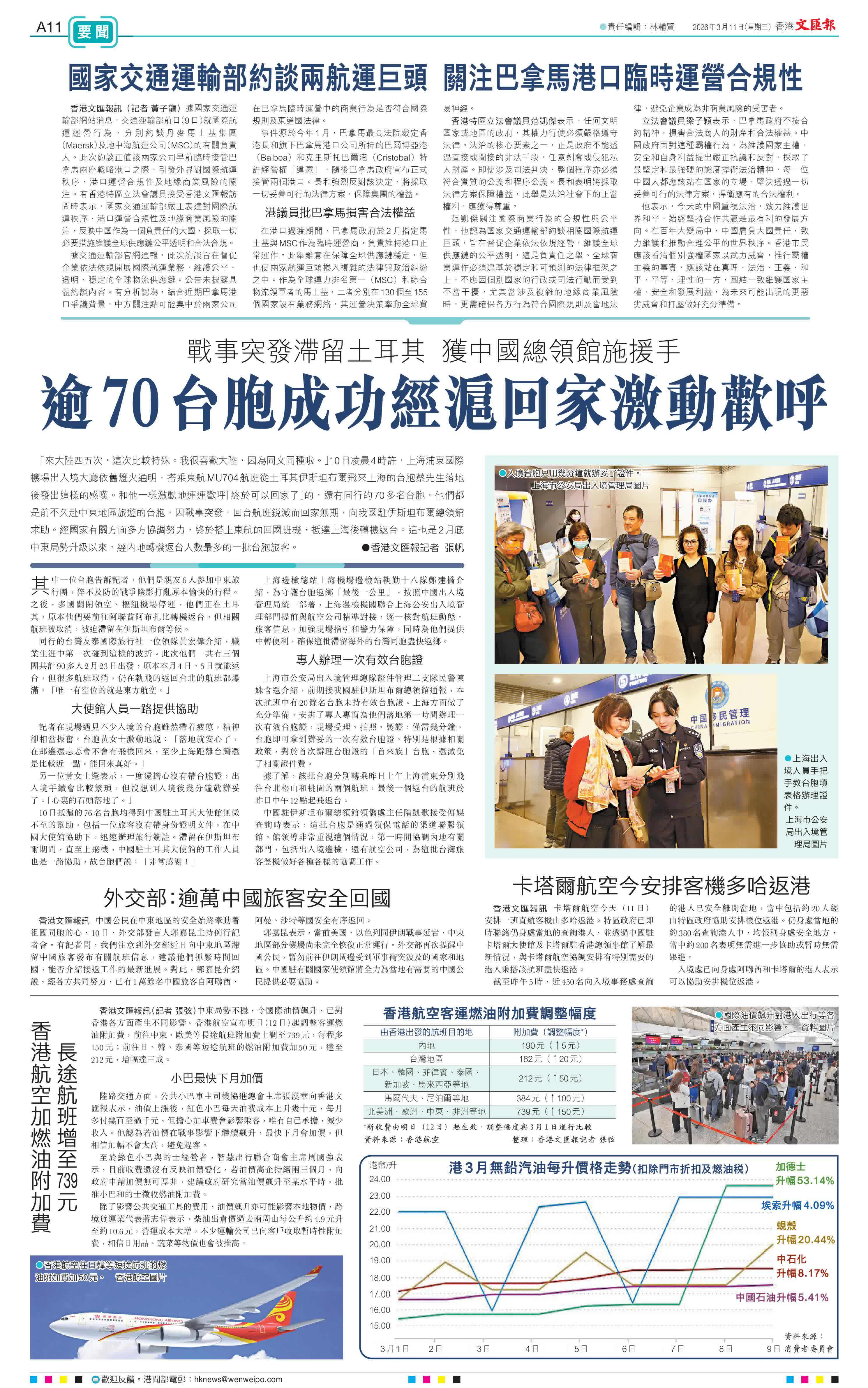 (香港文匯報記者 張帆)「來大陸四五次,這次比較特殊。我很喜歡大陸,因為同文同種啦。」10日凌晨4時許,上海浦東國際機場出入境大廳依舊燈火通明,搭乘東航MU704航班從土耳其伊斯坦布爾飛來上海的台胞蔡先生落地後發出這樣的感嘆。和他一樣激動地連連歡呼「終於可以回家了」的,還有同行的70多名台胞。他們都是前不久赴中東地區旅遊的台胞,因戰事突發,回台航班銳減而回家無期,向我國駐伊斯坦布爾總領館求助。經國家有關方面多方協調努力,終於搭上東航的回國班機,抵達上海後轉機返台。這也是2月底中東局勢升級以來,經內地轉機返台人數最多的一批台胞旅客。