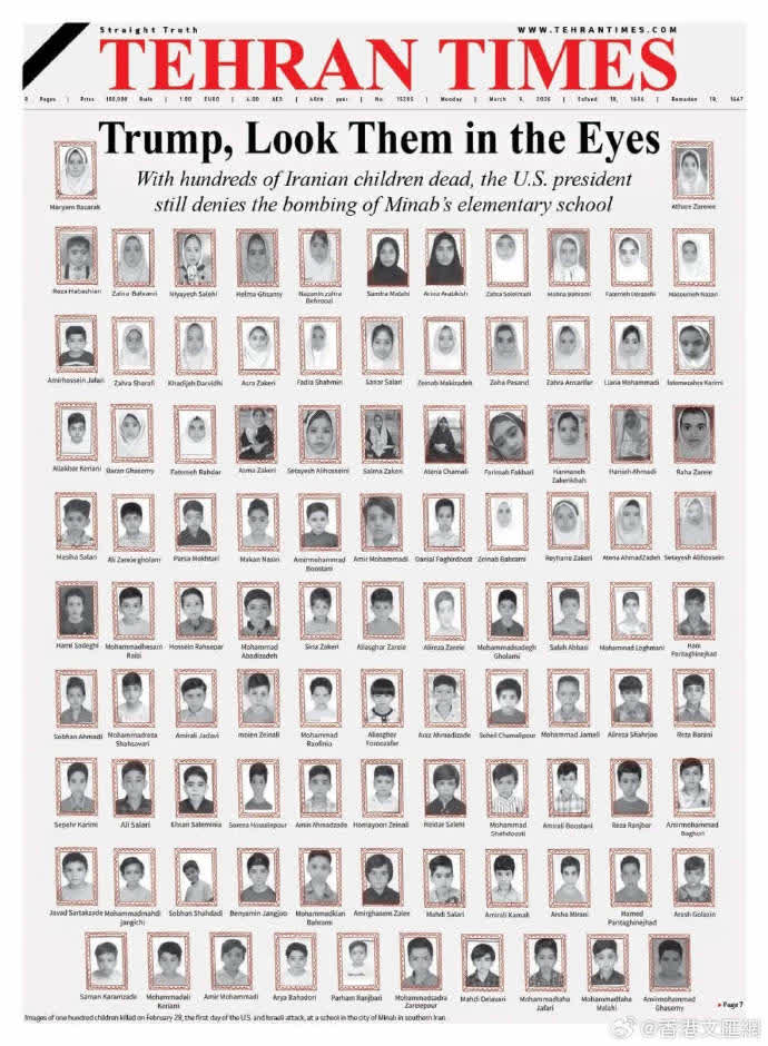 伊媒《德黑蘭時報》日前發布頭版,刊登100多名遇難兒童的遺照,這一極具衝擊力的頭版很快席捲全球社媒。該報社論直言,面對上百名無辜學童死於空襲,特朗普至今仍企圖否認事實:「愈來愈多的證據都指向美國,是美國政府仍在推卸責任。」