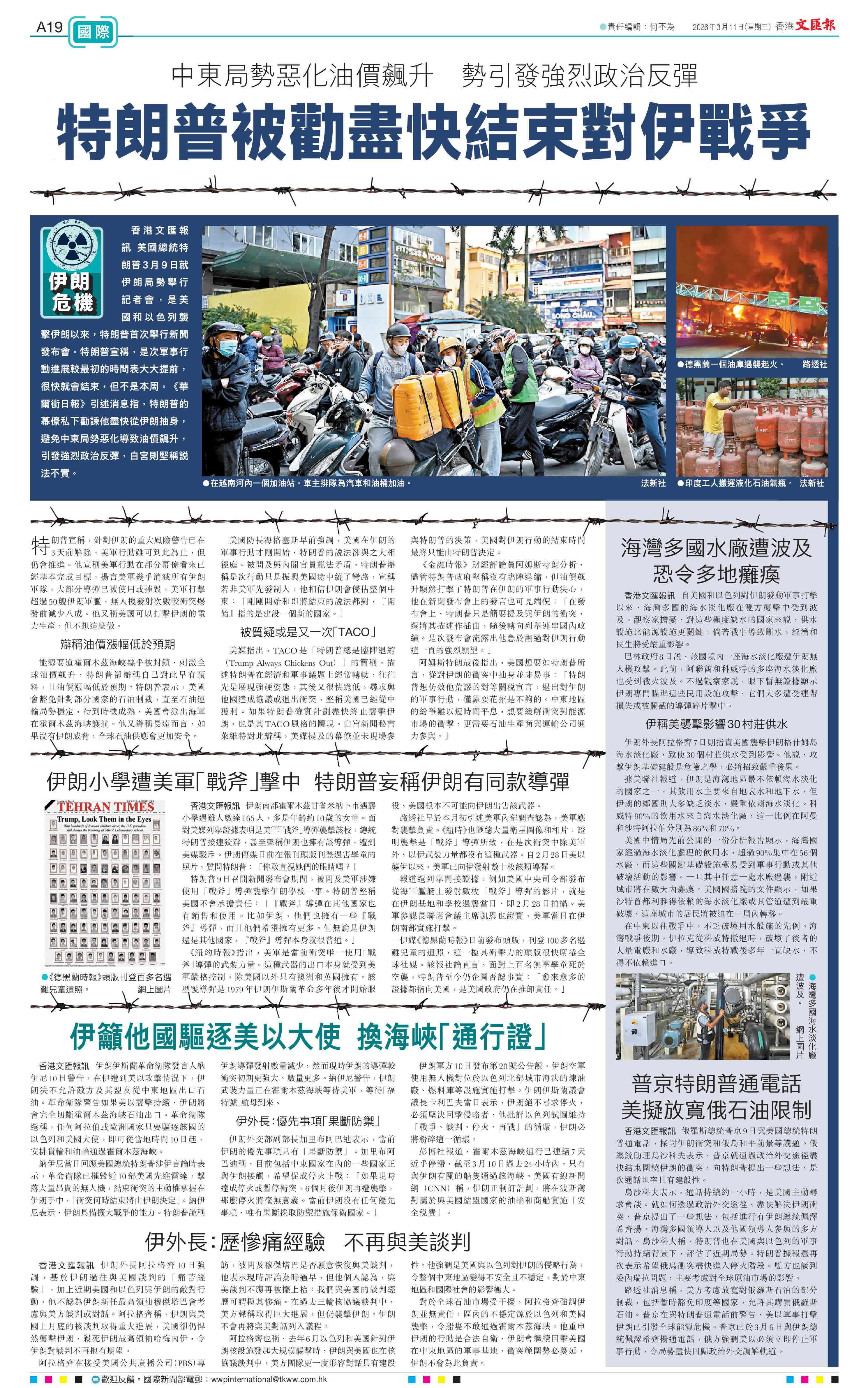 《金融時報》財經評論員阿姆斯特朗分析,儘管特朗普政府堅稱沒有臨陣退縮,但油價飆升顯然打擊了特朗普在伊朗的軍事行動決心,他在新聞發布會上的發言也可見端倪:「在發布會上,特朗普只是簡要提及與伊朗的衝突,還將其描述作插曲,隨後轉向列舉連串國內政績。是次發布會流露出他急於翻過對伊朗行動這一頁的強烈願望。」