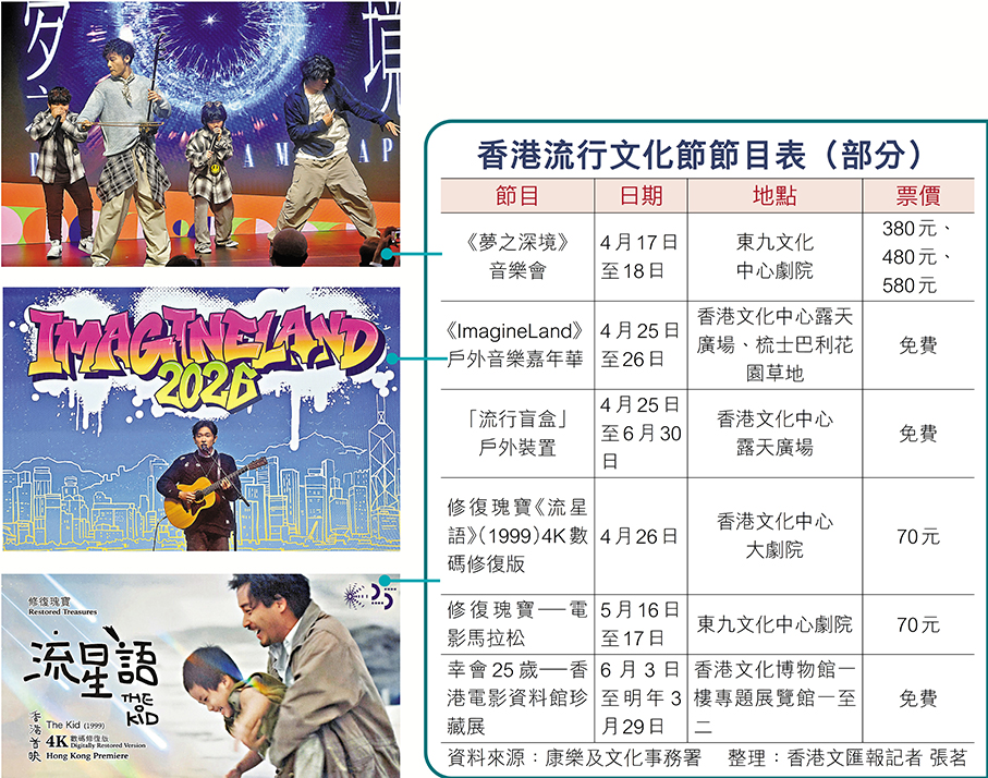「香港流行文化節」開幕節目《夢之深境》音樂會將於下月17日及18日在東九文化中心舉行,由二胡演奏家朱芸編與本地音樂人馮穎琪共同策劃,結合電影、音樂、街舞及藝術科技,編織出由3個章節組成的音樂盛宴,並邀得歌手林奕匡、陳泳伽、鄧小巧及李駿傑等擔任嘉賓,與一眾樂團以及合唱團成員演繹不同年代的流行歌曲,為文化節揭開序幕。
