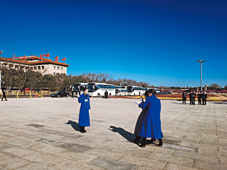 在全國政協十四屆四次會議閉幕的這天,人民大會堂外的天空幾乎是教科書式的「兩會藍」:紅旗在碧空下招展,簷角的琉璃瓦映着天光,藍得清透、深得厚重。廣場上,步出大會堂的委員們在台階上駐足、合影。