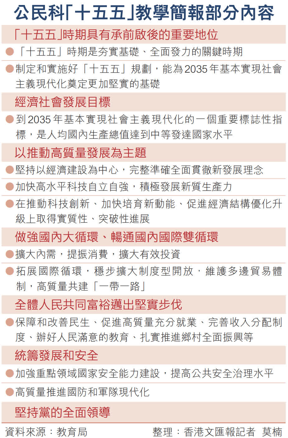 根據教育局的「十五五」教學簡報,教師可引導學生進行課前思考,嘗試認識國家百年宏觀規劃與五年規劃有什麼關係、「十五五」時期在國家規劃中有什麼重要地位等。簡報提到,二十屆四中全會高度評價「十四五」時期國家發展取得的重大成就,及提出了「十五五」時期經濟社會發展的主要目標等背景,並介紹了「十五五」規劃建議的多項重點觀點和重大舉措(見表)。