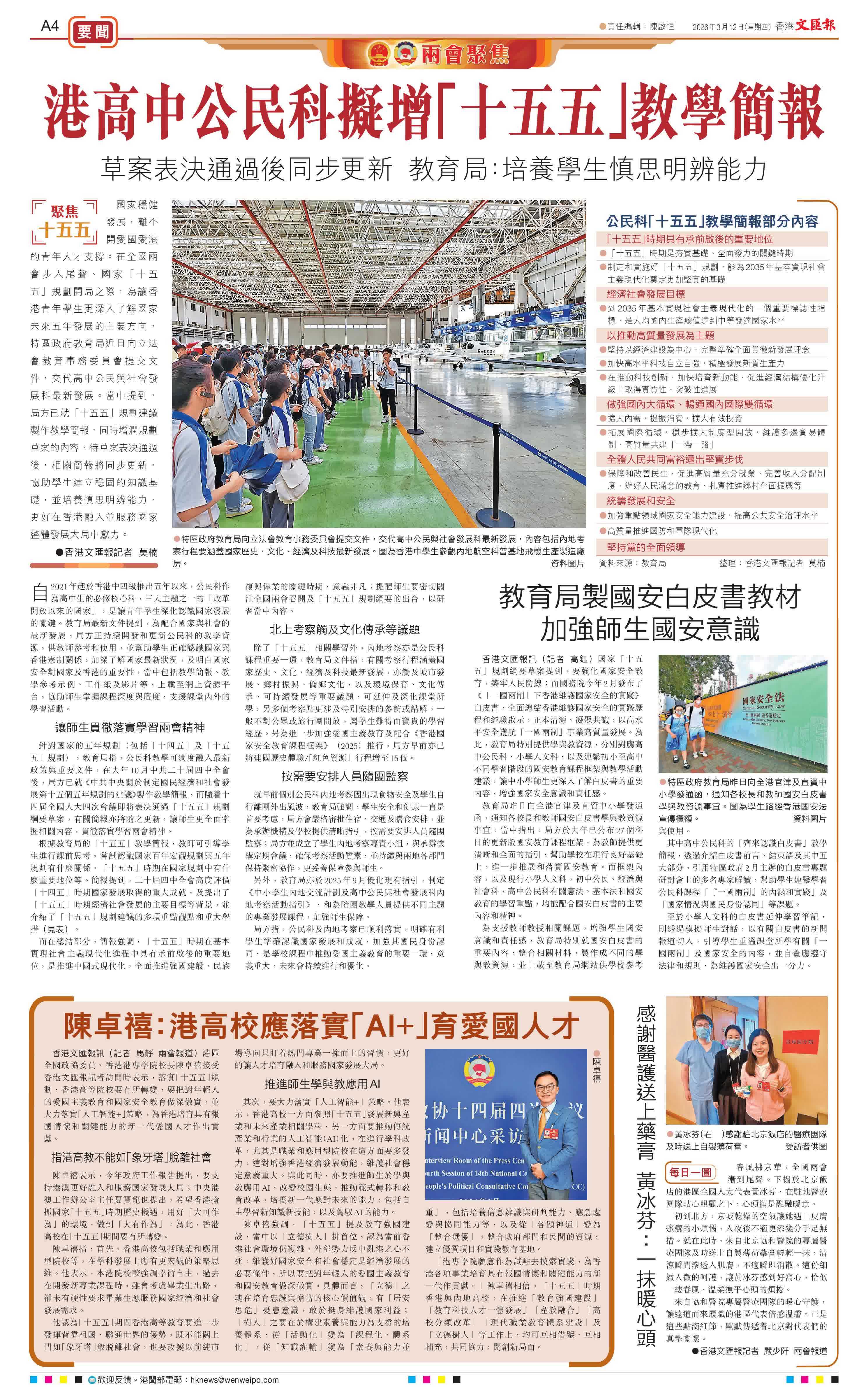 (香港文匯報記者 莫楠)國家穩健發展,離不開愛國愛港的青年人才支撐。在全國兩會步入尾聲、國家「十五五」規劃開局之際,為讓香港青年學生更深入了解國家未來五年發展的主要方向,特區政府教育局近日向立法會教育事務委員會提交文件,交代高中公民與社會發展科最新發展。當中提到,局方已就「十五五」規劃建議製作教學簡報,同時增潤規劃草案的內容,待草案表决通過後,相關簡報將同步更新,協助學生建立穩固的知識基礎,並培養慎思明辨能力,更好在香港融入並服務國家整體發展大局中獻力。