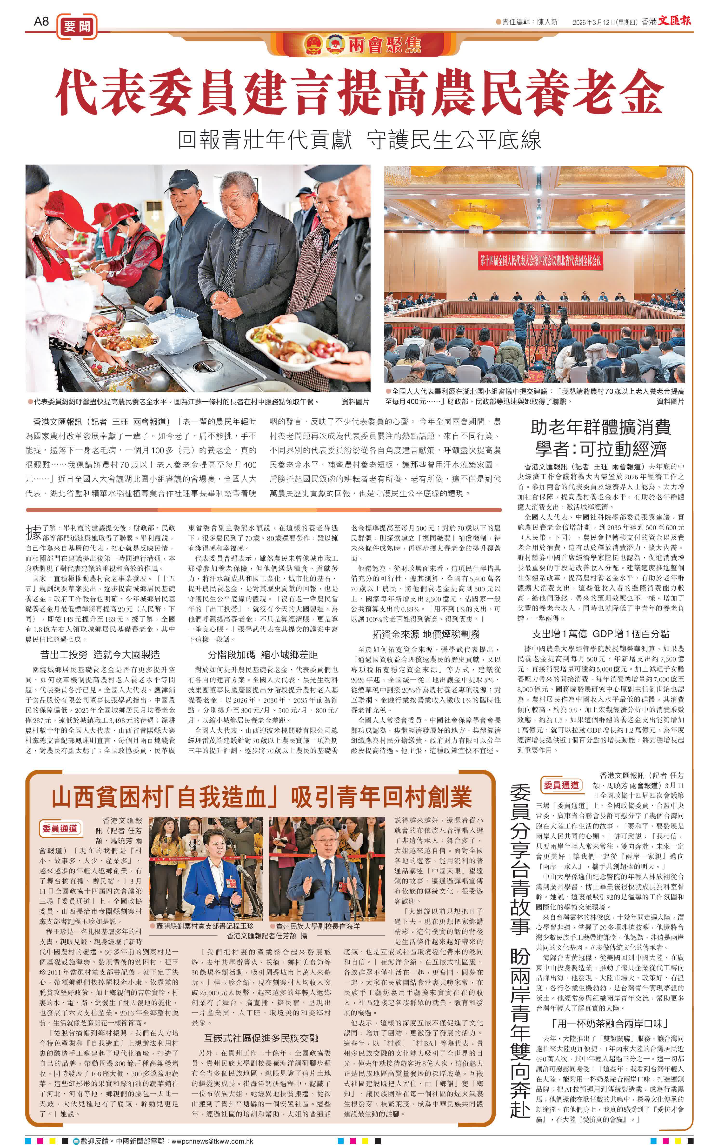 香港文匯報訊(記者 王珏 兩會報道)「老一輩的農民年輕時為國家農村改革發展奉獻了一輩子。如今老了,肩不能挑,手不能提,還落下一身老毛病,一個月100多(元)的養老金,真的很艱難……我懇請將農村70歲以上老人養老金提高至每月400元……」近日全國人大會議湖北團小組審議的會場裏,全國人大代表、湖北省監利精華水稻種植專業合作社理事長畢利霞帶着哽咽的發言,反映了不少代表委員的心聲。 今年全國兩會期間,農村養老問題再次成為代表委員關注的熱點話題,來自不同行業、不同界別的代表委員紛紛從各自角度建言獻策,呼籲盡快提高農民養老金水平、補齊農村養老短板,讓那些曾用汗水澆築家園、肩膀托起國民飯碗的耕耘者老有所養、老有所依,這不僅是對億萬農民歷史貢獻的回報,也是守護民生公平底線的體現。
