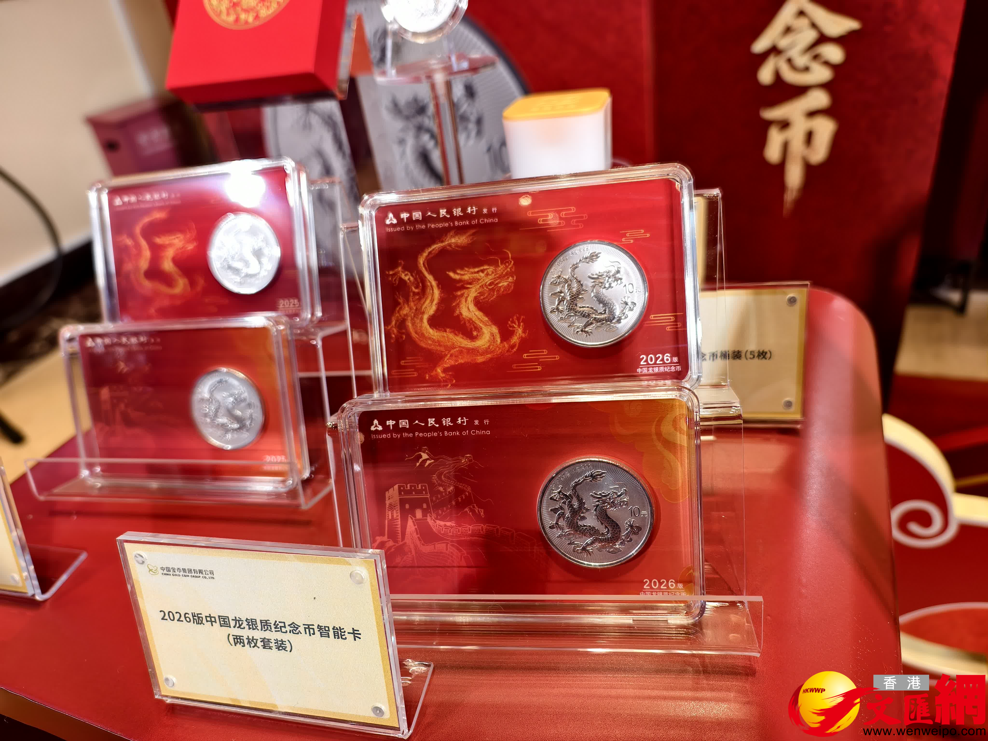 (香港文匯網記者 馬曉芳)2026版中國龍銀質紀念幣品鑒會11日在京舉行,現場展出了中國龍系列多款產品,包括封裝版、智能卡、雙品牌等。2026版中國龍銀質紀念幣為普制幣,含純銀31.104克,直徑38毫米,面額10元,成色99.9%,最大發行量2000000枚。紀念幣正面圖案為鳥瞰視角的長城,並刊國名、年號。背面圖案以中國龍為主輔以祥雲元素構成,幣面十分生動。