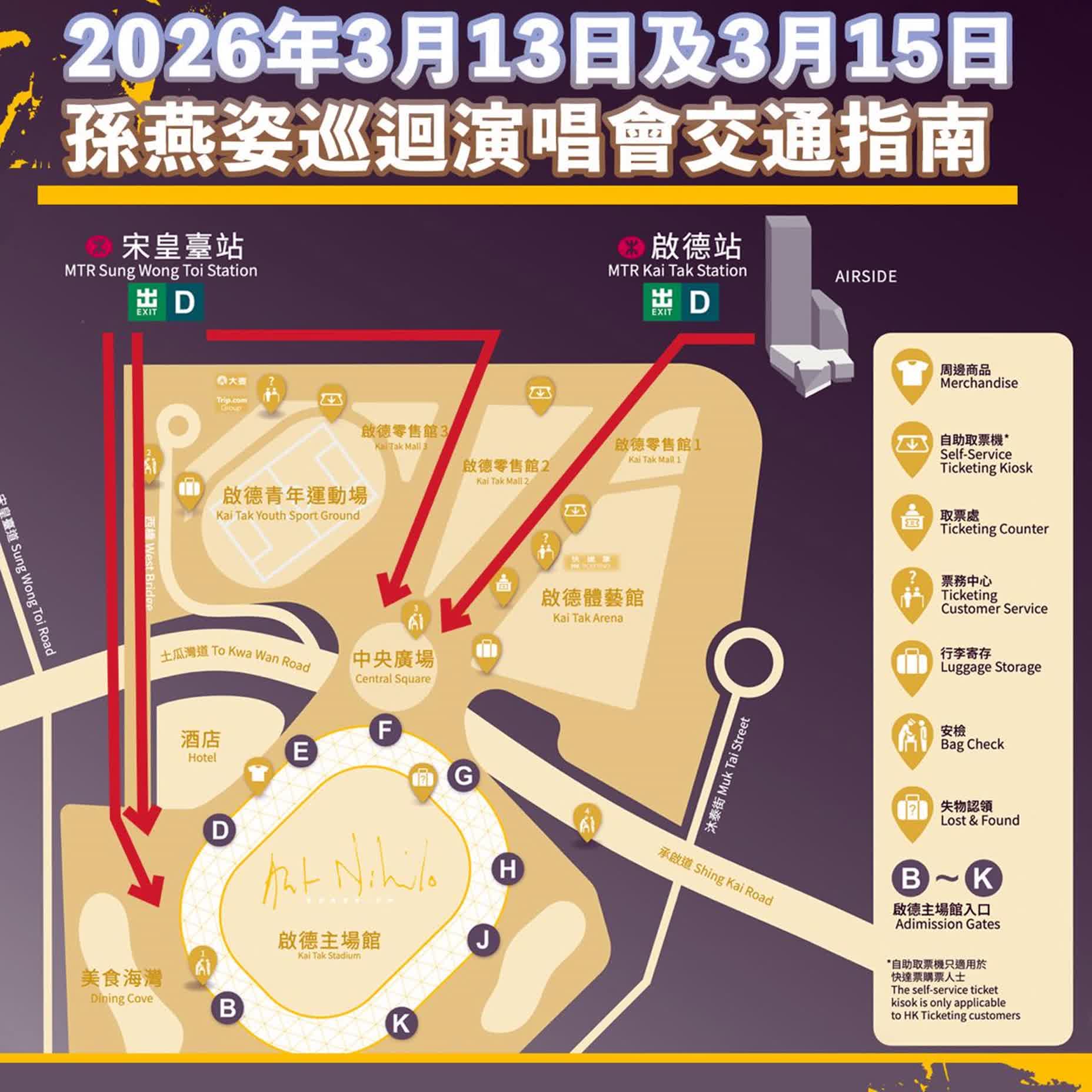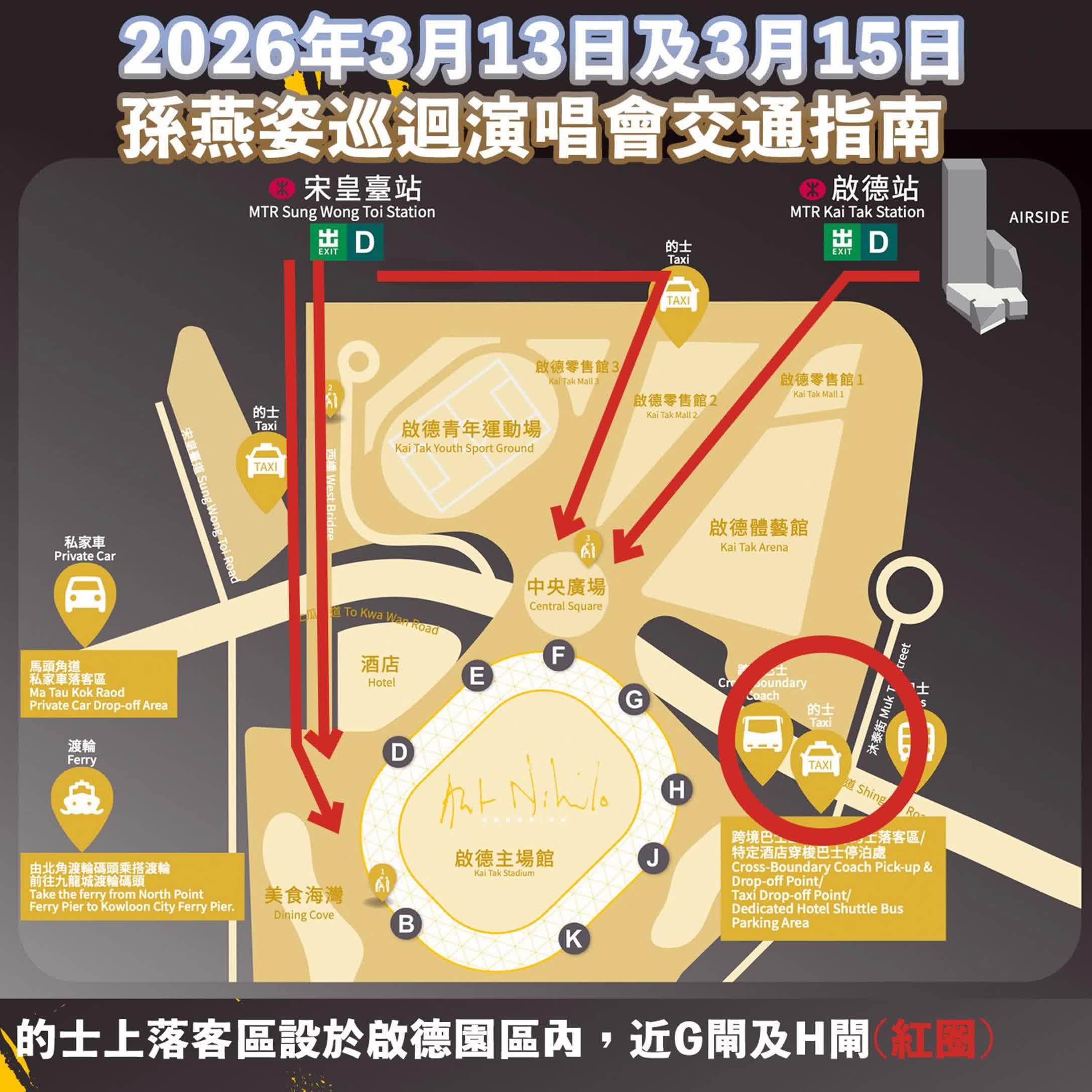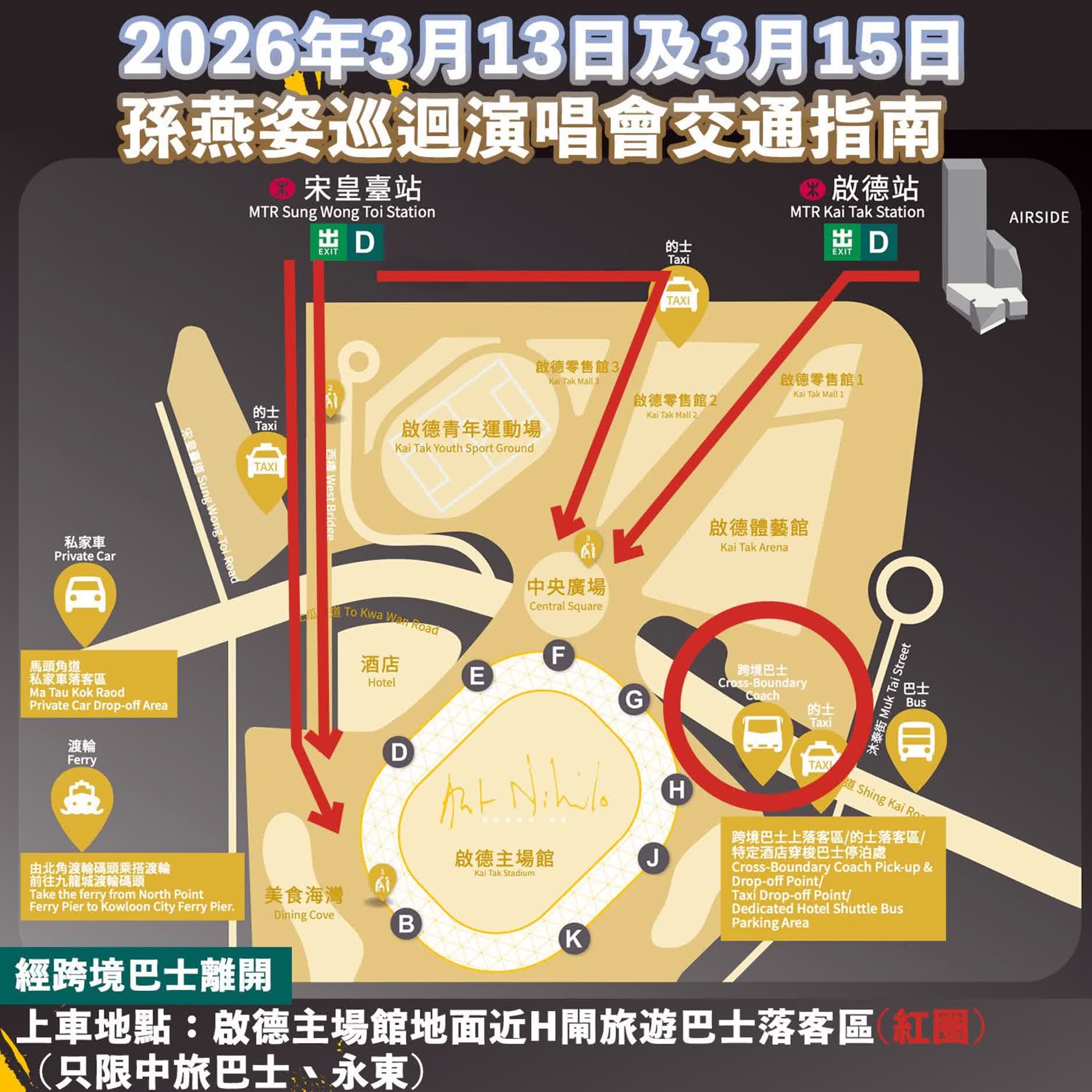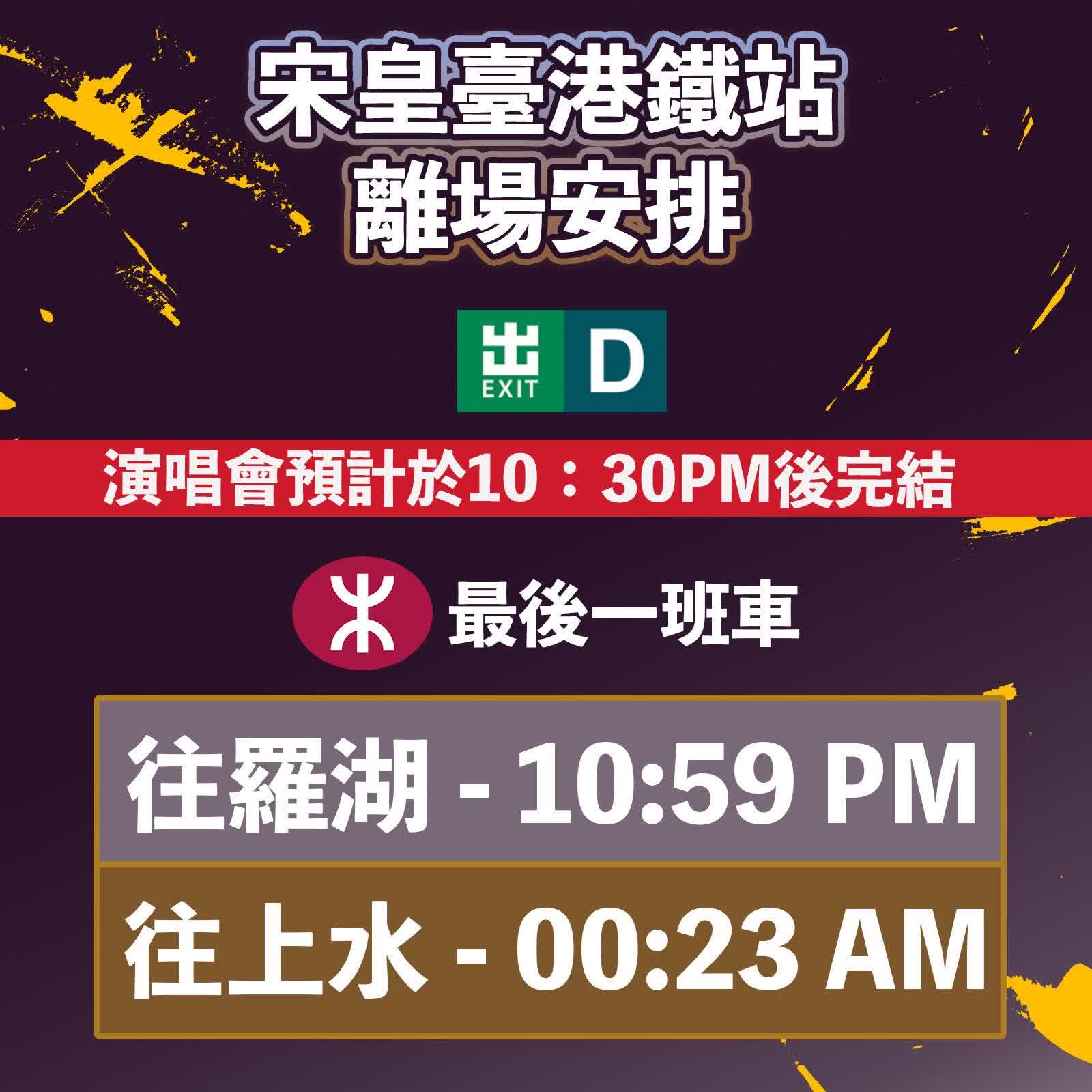 - 由於演出在07:30PM開始,預計10:30PM後結束。觀眾除可在宋皇臺站或啟德站搭乘往羅湖方向的列車,也可選乘港鐵往上水方向,或搭乘巴士路線SP12前往新田。
