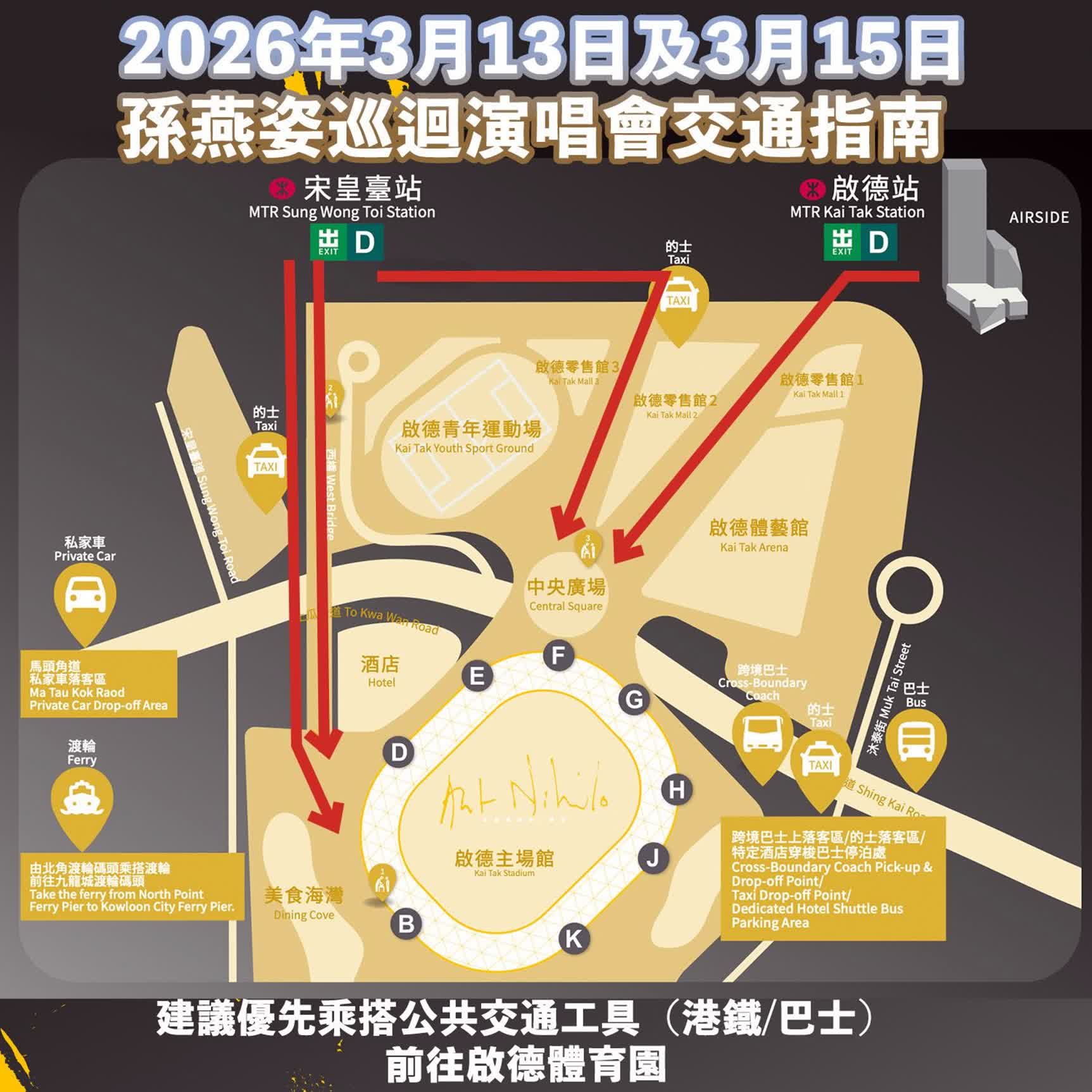 - 建議優先使用公共交通工具(港鐵/巴士)前往啟德體育園