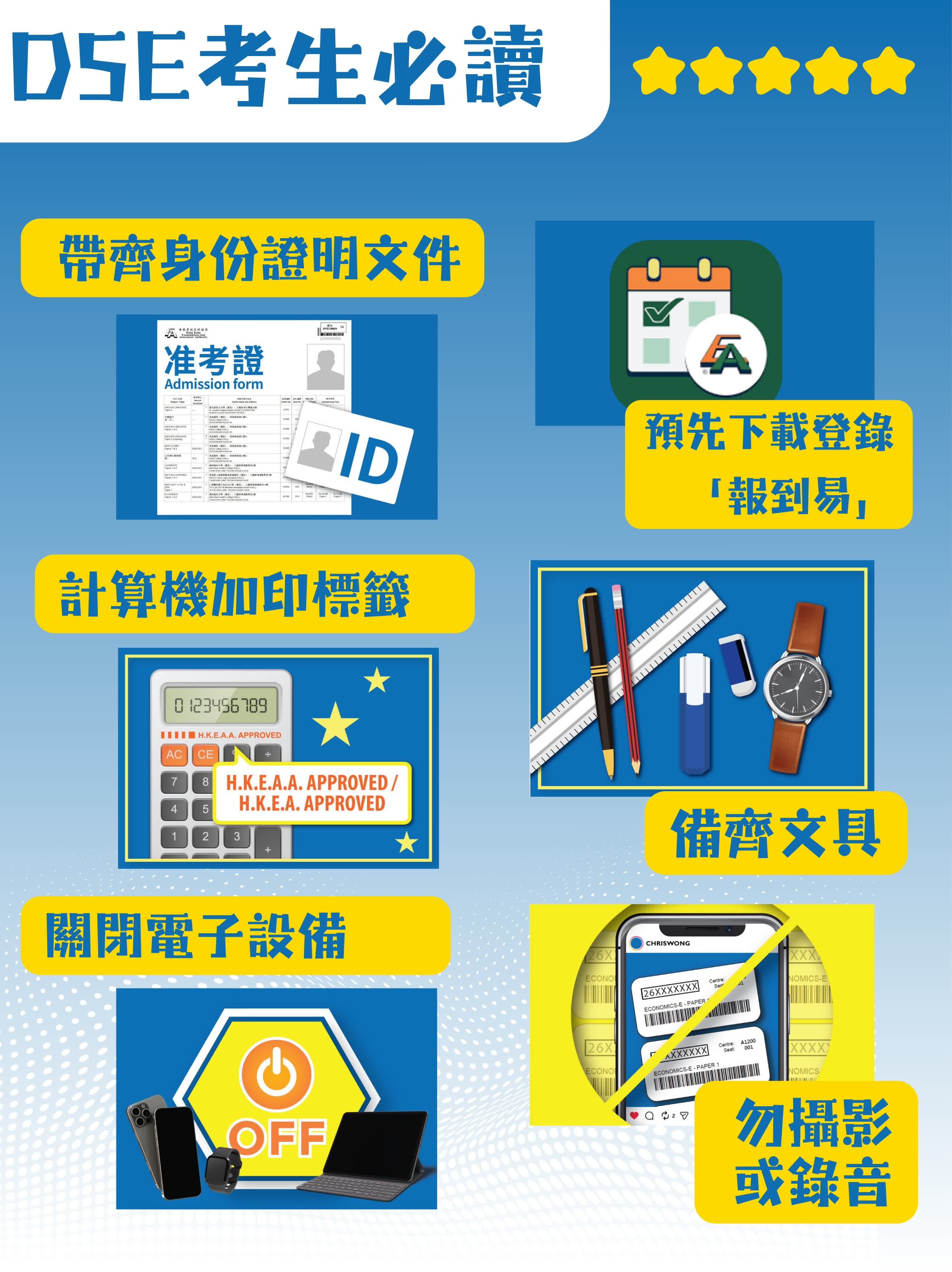 香港文匯報訊(記者 楊盈盈)2026年DSE筆試將於4月8日開考,香港考試及評核局今日在「文憑試快線」網頁上載「2026 DSE點部署:應考筆試注意事項」,提醒考生努力備試之餘,也要記得了解清楚考試規則及安排。為確保應屆考生能順利應考,避免因一時疏忽而遭到扣分甚至取消成績的處分,香港文匯報特此為廣大考生整理了考評局最新的應試裝備及電子器材注意事項,助大家做足準備,安心踏上試場。