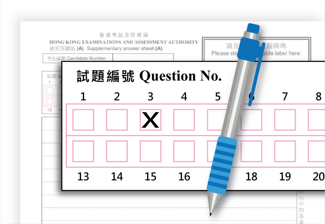 在作答細節方面,考生必須於考試時間內,在每頁寫有答案的答題簿內頁及補充答題紙上方,以原子筆或鉛筆在相應的試題編號方格內畫上「×」號。若錯填或漏填,該頁答案有可能不獲評閱。值得留意的是,若題目設有分題(例如第一題包含a、b、c三部分),考生只需填畫主試題編號「1」即可。與Barcode貼紙的規定一樣,試場主任宣布「停止作答」後,考生嚴禁繼續填畫試題編號方格,違規者會被扣分。