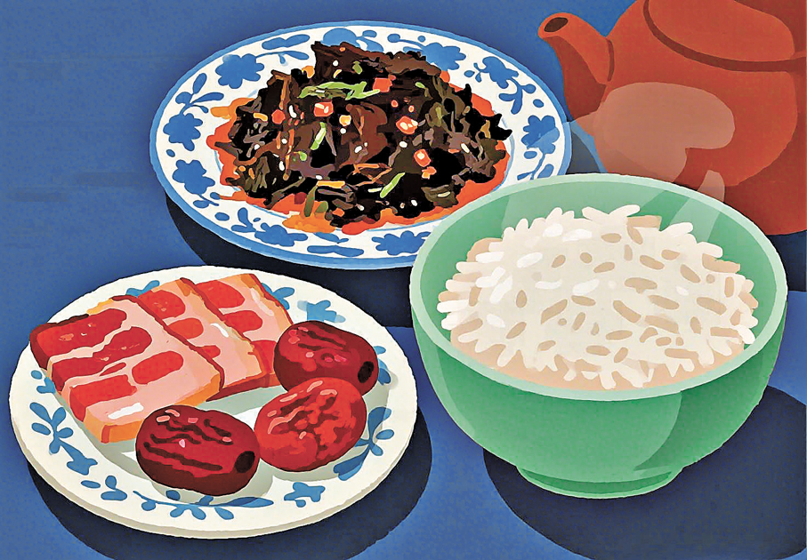 他動手將梅乾菜茸勻鋪在熱飯上。深褐的菜茸一碰到雪白的飯,那股幽微的香氣陡然濃烈起來——是被陽光和時光反覆醃透的鹹香,醇厚得像一段往事。他又鋪上臘肉,肥的部分被熱氣熏得晶瑩,瘦的部分愈發深紅緊實。最後撒上紅棗,紅、黑、白、金,錯落在青瓷碗裏,竟有了幾分古畫裏「歲寒清供」的意趣。