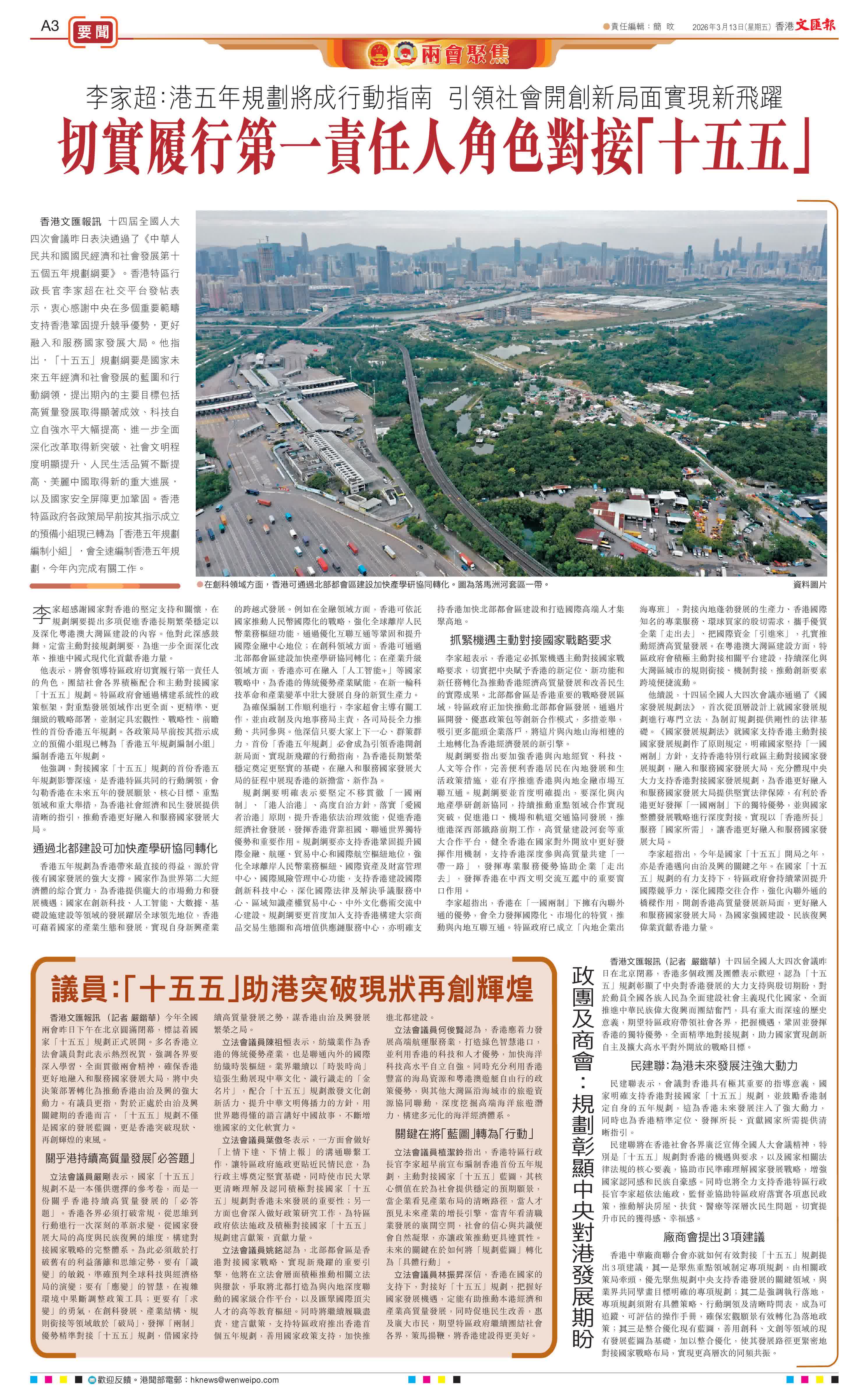 立法會議員嚴剛表示,國家「十五五」規劃不是一本僅供選擇的參考卷,而是一份關乎香港持續高質量發展的「必答題」。香港各界必須打破常規,從思維到行動進行一次深刻的革新求變,從國家發展大局的高度與民族復興的維度,構建對接國家戰略的完整體系。為此必須敢於打破舊有的利益藩籬和思維定勢,要有「識變」的敏銳,準確預判全球科技與經濟格局的演變;要有「應變」的智慧,在複雜環境中果斷調整政策工具;更要有「求變」的勇氣,在創科發展、產業結構、規則銜接等領域敢於「破局」,發揮「兩制」優勢精準對接「十五五」規劃,借國家持續高質量發展之勢,謀香港由治及興發展繁榮之局。