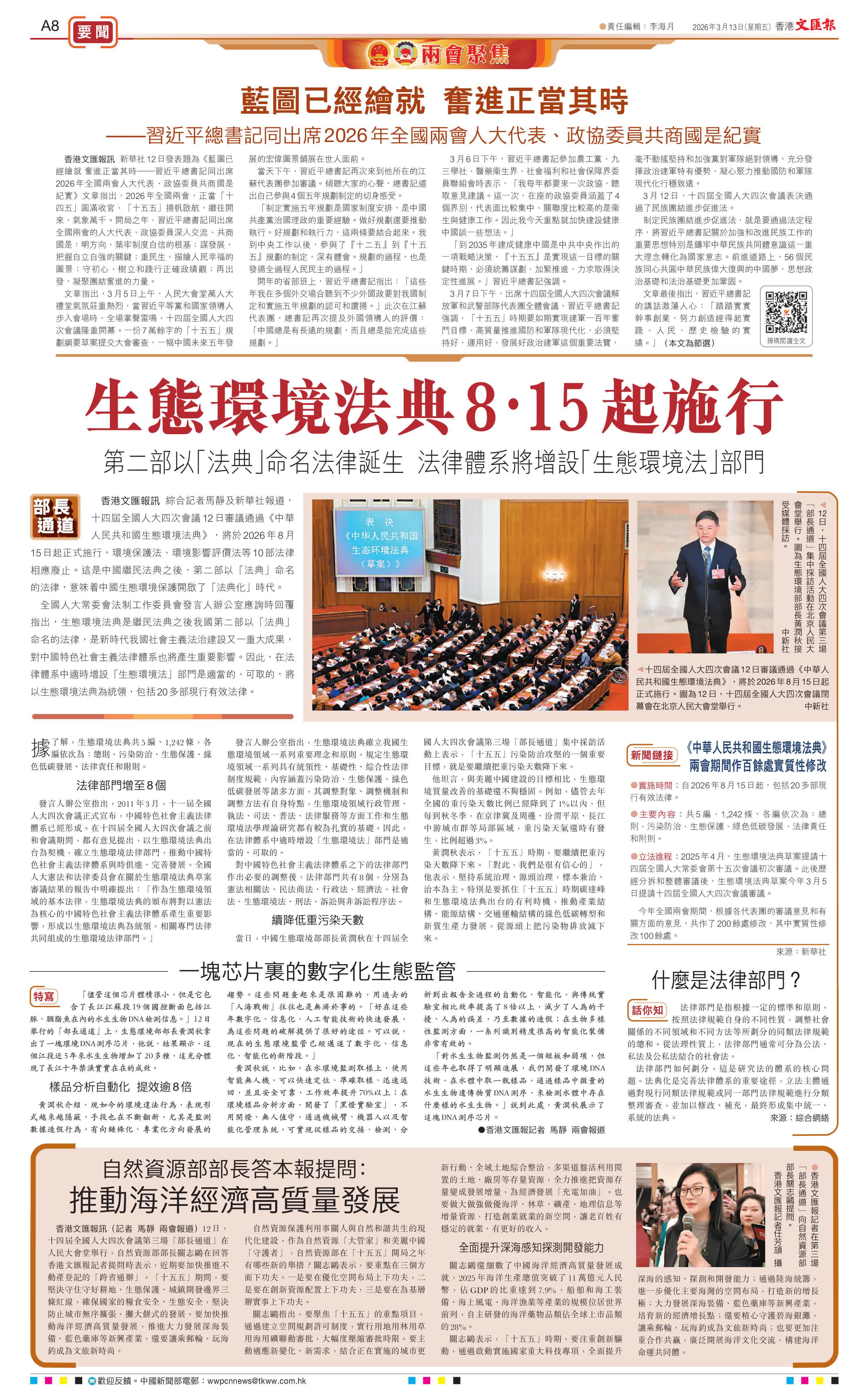 香港文匯報訊 綜合記者馬靜及新華社報道,十四屆全國人大四次會議12日審議通過《中華人民共和國生態環境法典》,將於2026年8月15日起正式施行,環境保護法、環境影響評價法等10部法律相應廢止。這是中國繼民法典之後,第二部以「法典」命名的法律,意味着中國生態環境保護開啟了「法典化」時代。
