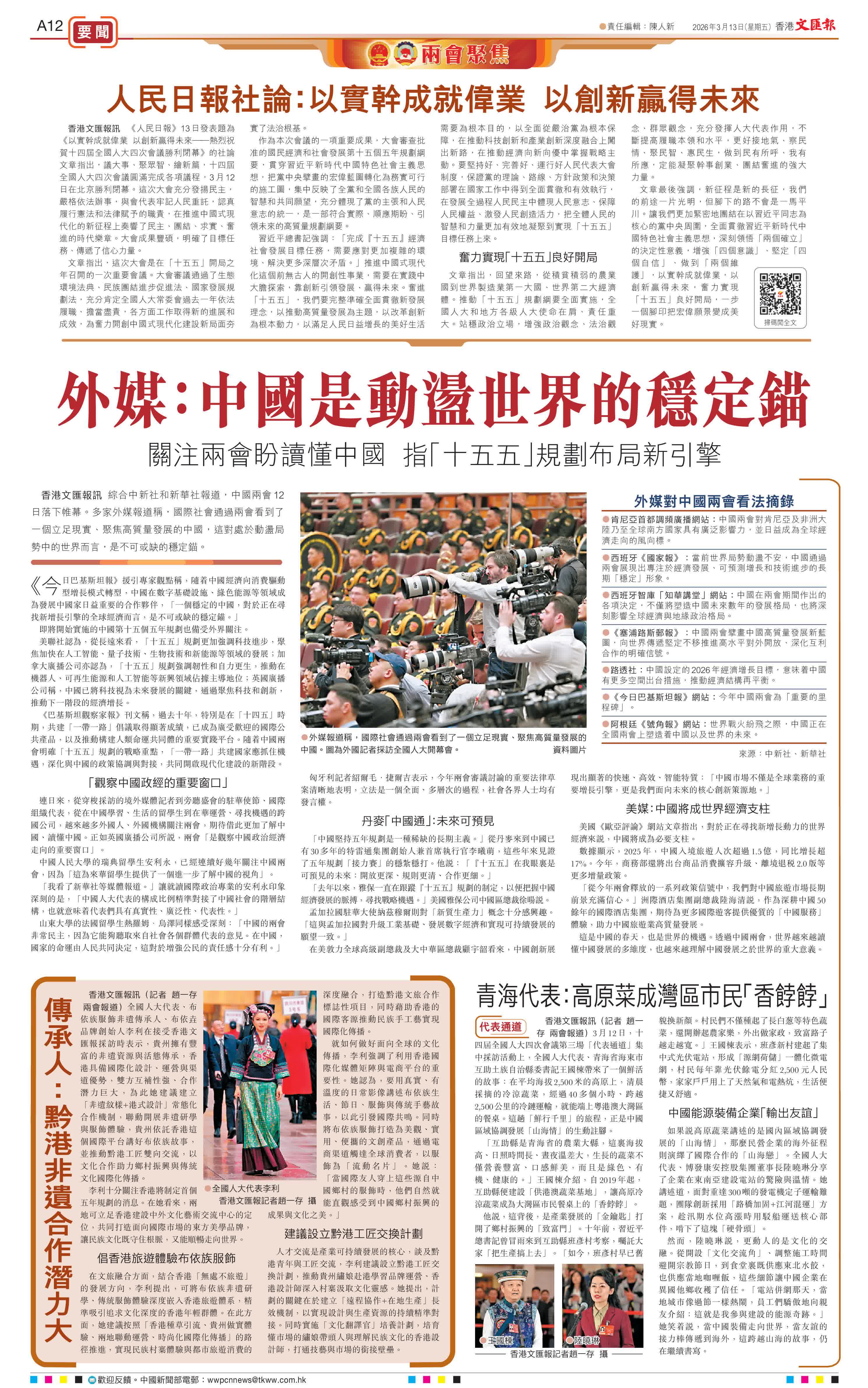 香港文匯報訊 綜合中新社和新華社報道,中國兩會12日落下帷幕。多家外媒報道稱,國際社會通過兩會看到了一個立足現實、聚焦高質量發展的中國,這對處於動盪局勢中的世界而言,是不可或缺的穩定錨。