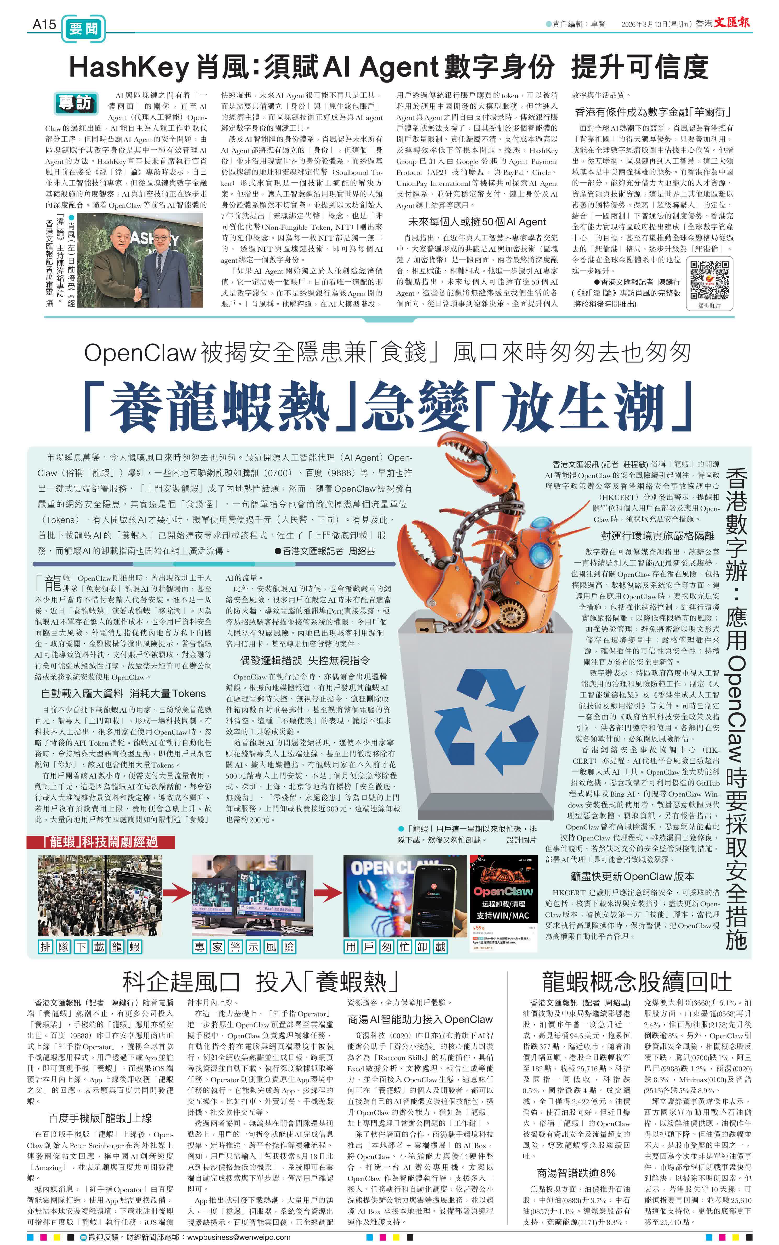 (香港文匯報記者 周紹基)市場瞬息萬變,令人慨嘆風口來時匆匆去也匆匆。最近開源人工智能代理(AI Agent)OpenClaw(俗稱「龍蝦」)爆紅,一些內地互聯網龍頭如騰訊、百度等,早前也推出一鍵式雲端部署服務,「上門安裝龍蝦」成了內地熱門話題;然而,隨着OpenClaw被揭發有嚴重的網絡安全隱患,其實還是個「食錢怪」,一句簡單指令也會偷偷跑掉幾萬個流量單位(Tokens),有人開啟該AI才幾小時,賬單使用費便過千元(人民幣,下同)。有見及此,首批下載龍蝦AI的「養蝦人」已開始連夜尋求卸載該程式,催生了「上門徹底卸載」服務,而龍蝦AI的卸載指南也開始在網上廣泛流傳。