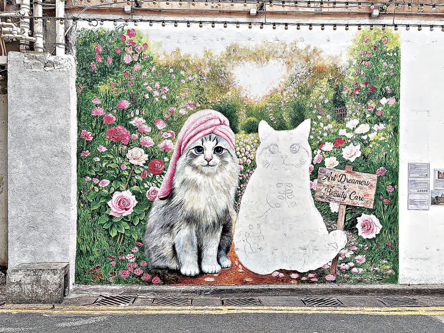 港鐵油麻地站D出口離開,行幾步就可以看見不遠處巨型貓咪壁畫。這幅壁畫位於僑江大廈外牆,在油麻地鬧市中引來許多行人駐足打卡。壁畫以美容、美甲、貓咪作為主題元素,構建出一個充滿浪漫與療癒感的玫瑰花園場景,兩隻貓咪並肩坐在盛放的玫瑰花園中,在陽光下靜靜享受悠閒時光。左邊的布偶貓剛完成護理,頭上包着粉嫩浴巾,毛髮蓬鬆細緻,神情溫柔優雅,畫面栩栩如生。慳妹到時,壁畫中右邊的小貓還未畫完,只見大致輪廓。不過壁畫所在的道路是消防局的後門,會有好多車輛進進出出,大家打卡要注意安全。