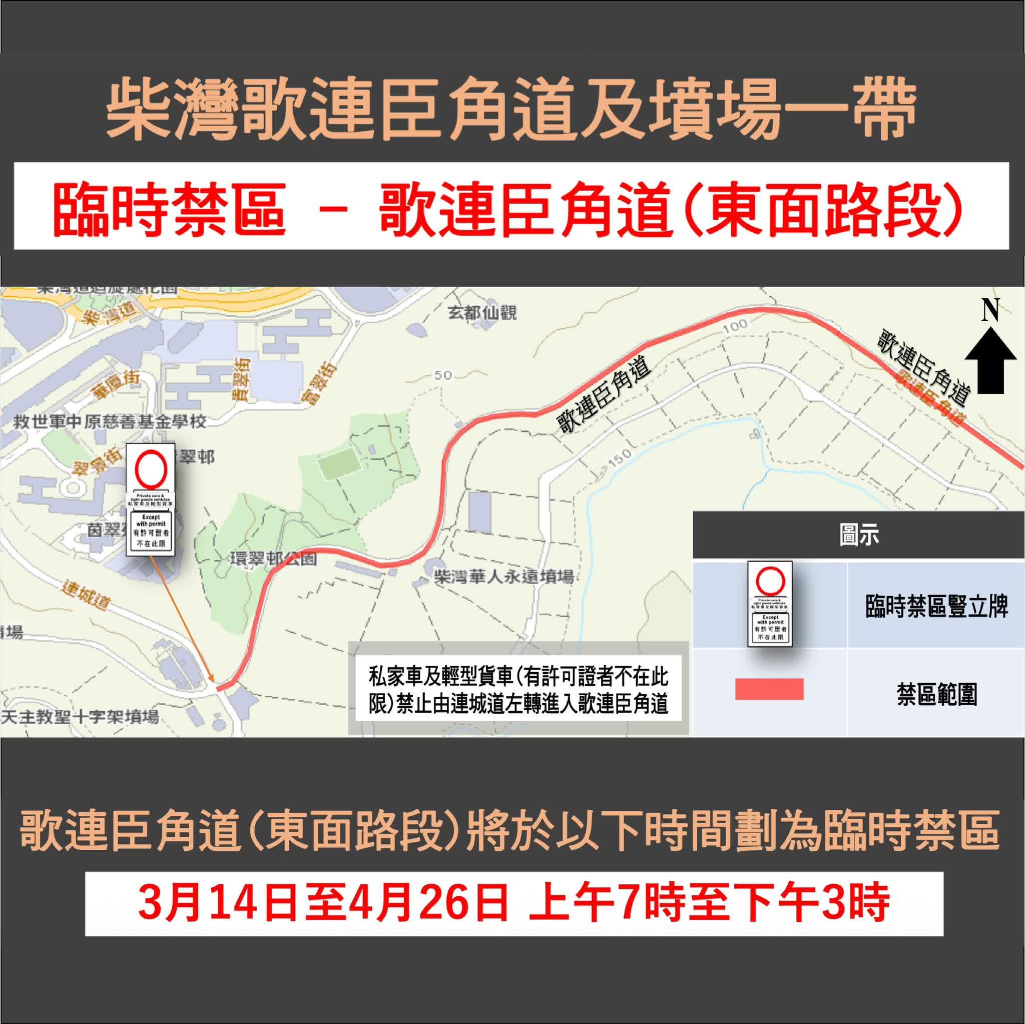 🔸 臨時禁區將於3月14日至4月26日上午7時至下午3時實施,屆時所有私家車及輕型貨車(除經由運輸署署長發給許可證者外)一律禁止由連城道(南行)左轉進入歌連臣角道(以東方向)。