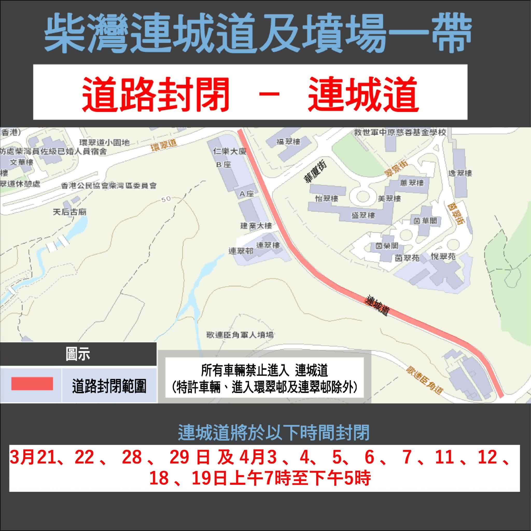 🔸 連城道將於3月21、22、28、29日及4月3、4、5#、6、7、11、12、18、19日上午7時至下午5時封閉,屆時環翠道所有車輛不能進入連城道(特許車輛*、進入環翠邨及連翠邨的車輛除外)。