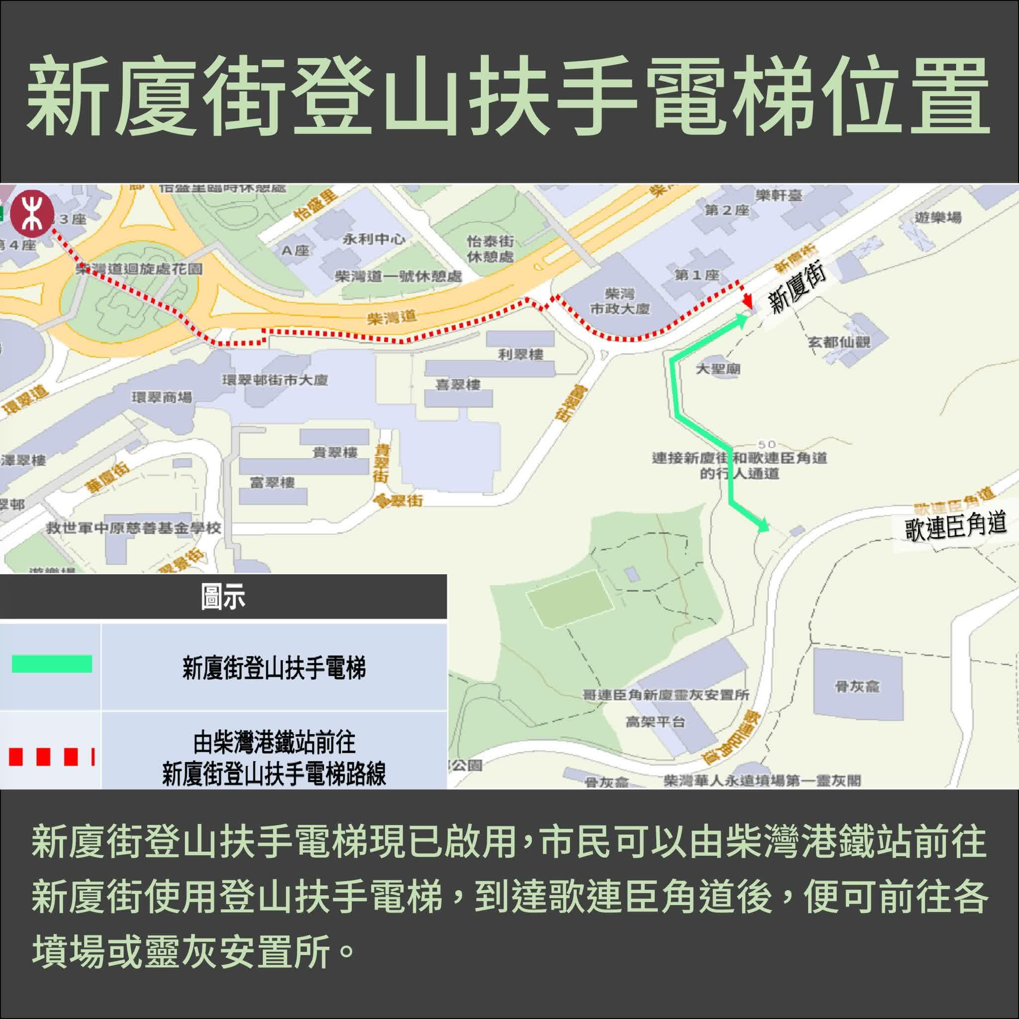 🔸 新廈街登山扶手電梯現已啟用,市民可以由柴灣港鐵站前往新廈街乘搭登山扶手電梯,上到歌連臣角道,再前往山上各墳場或靈灰安置所。