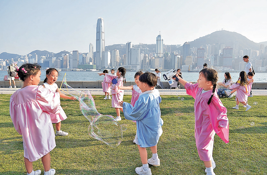 ●在西九海濱長廊,一班天真活潑的小朋友互吹肥皂泡開心嬉戲,度過一個快樂的下午。 香港文匯報記者曾興偉 攝