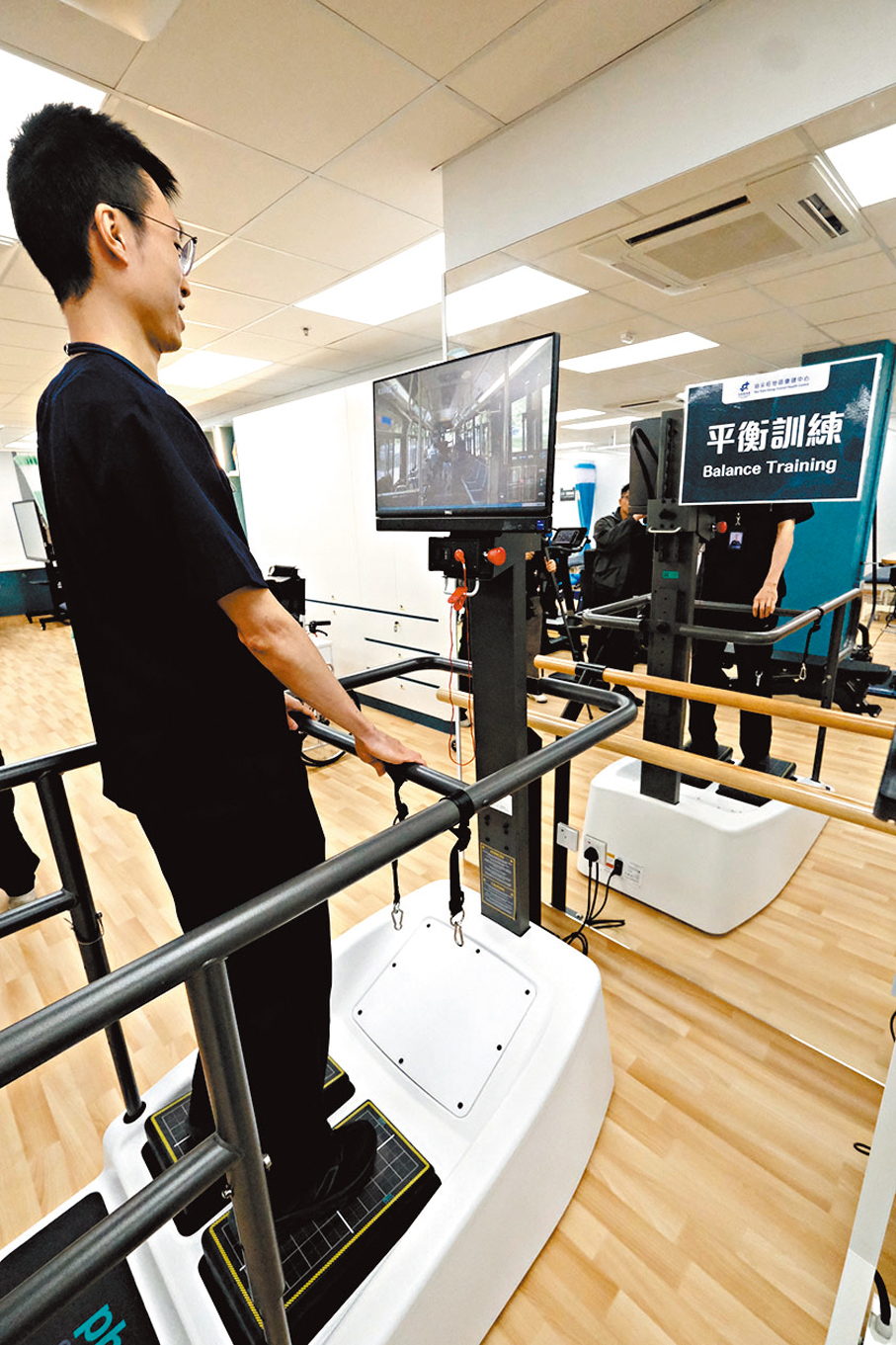 香港文匯報記者昨日參觀了油尖旺地區康健中心,內裏包括一間空間寬敞的治療室,有物理治療師表示會員會先到評估區作詳細評估,分析其姿勢、體態等,找出痛症原因再制定治療方案。該物理治療師並表示治療室內有一台儀器引入虛擬實景,包括有超過30個場景,例如巴士,虛擬場景配合踏板為會員進行平衡訓練。