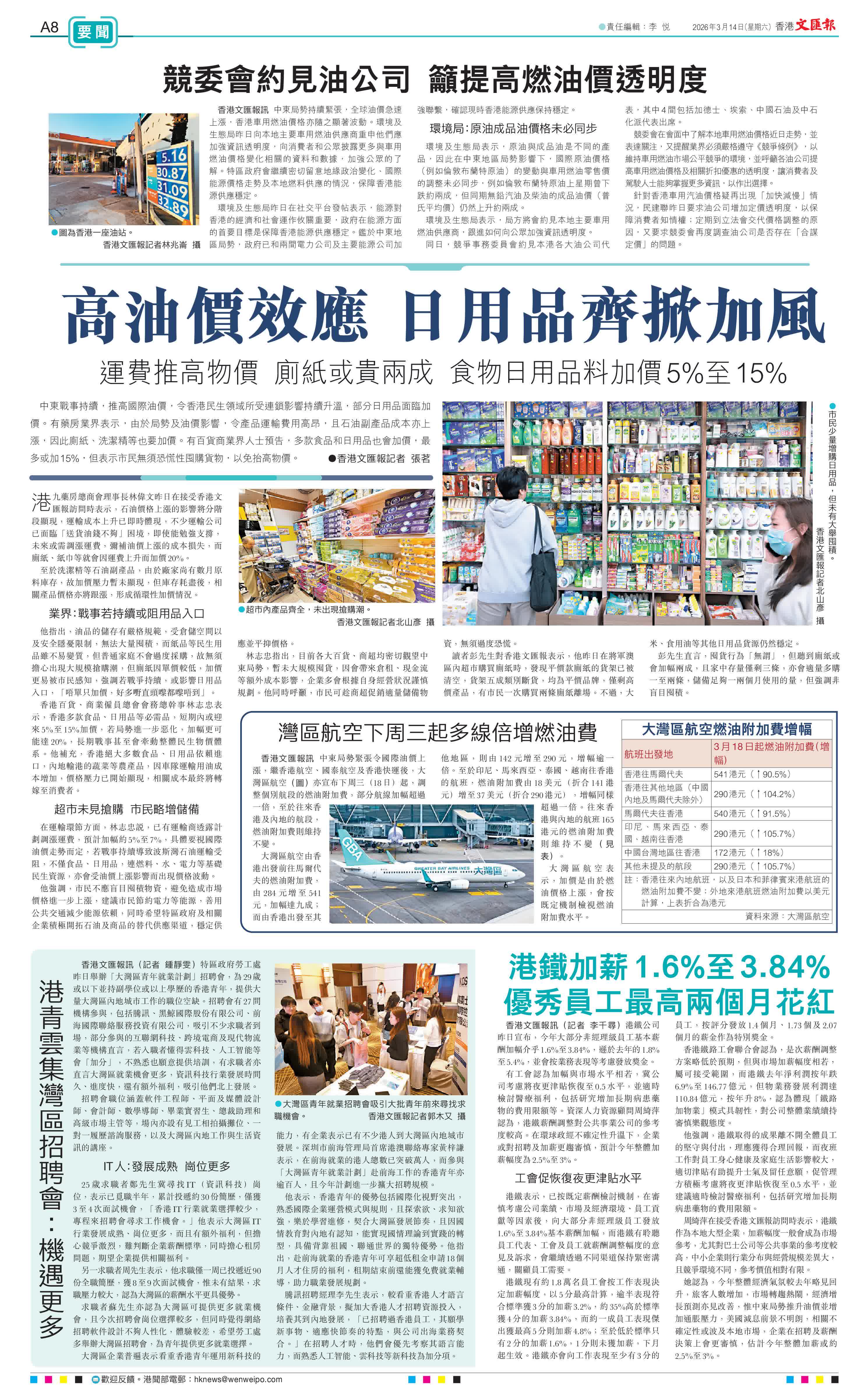 香港文匯報訊 中東局勢緊張令國際油價上漲,繼香港航空、國泰航空及香港快運後,大灣區航空(圖)亦宣布下周三(18日)起,調整個別航段的燃油附加費,部分航線加幅超過一倍,至於往來香港及內地的航段,燃油附加費則維持不變。
