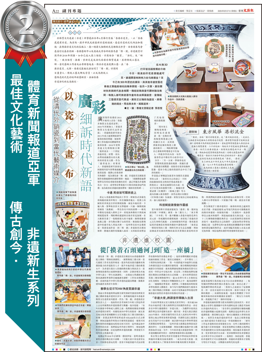 獲得最佳文化藝術體育新聞亞軍的《傳古創今·非遺新生系列》,由記者張岳悅完成。她表示,去年首屆「香港非遺月」期間,自己選擇了廣彩、花牌紮作、霓虹光管製作及造型三項技藝,並走進課堂、師傅的工作室、學校和博物館,訪問傳承人、學生、藝術家與學者,試圖從不同視角,記錄非遺在香港的當下面貌。是次獲獎正提醒她在未來的日子裏,繼續俯下身、沉下心,做好時代的記錄者,讓更多美好的事物被看見、被記住。
