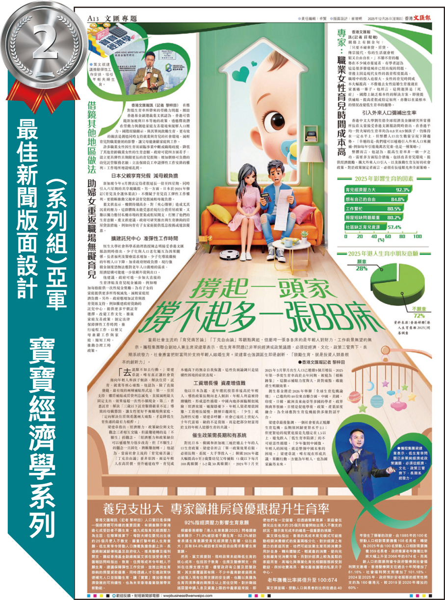 最佳新聞版面設計(系列組)的亞軍由梁麗芬、崔竣明設計的《寶寶經濟學系列》奪得。梁麗芬分享,版面設計不僅是美學的表達,更是一種資訊傳達的藝術。她感謝團隊在圖像、字體及顏色設計上,都抱着大膽嘗試、細心調節的態度,提煉出有畫面、有故事、有感染力的標題方向,令設計更準確拿捏核心內容。