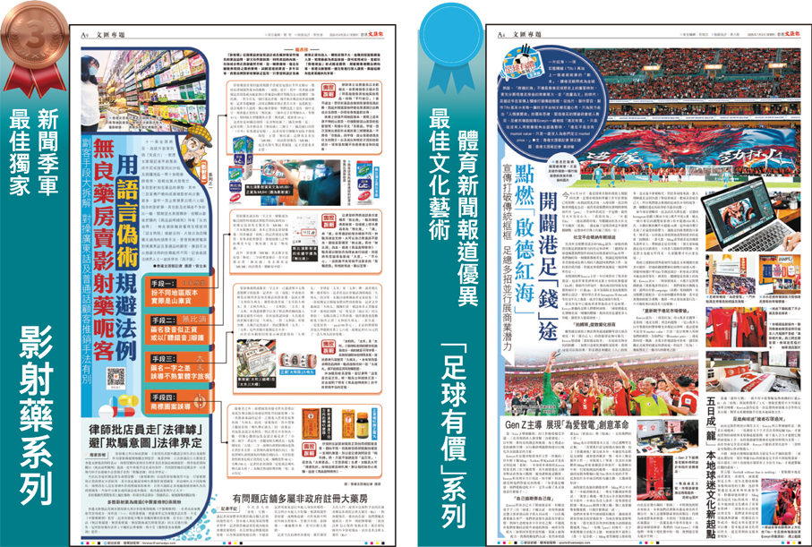 隨着體育運動於香港社會重視程度提高,今屆獎項的最佳文化藝術體育新聞報道特別進行改革,首次將體育相關新聞內容納入其中。以《「足球有價」系列》獲優異獎的郭正謙分享,報道始於一個疑問:「當世界盃決賽周遙不可及,甚至打入亞洲盃決賽周都算是『歷史性』的港足,能夠號召超過4萬名球迷連場支持,香港足球這彷彿突如其來的價值究竟是什麼?」為此,他和同事走進香港足總市場部,並飛赴韓國,證明了港足的價值並不只是冰冷的數字,而在每個入場打氣的人、每個為愛發電的參與者、每個願意相信香港足球值得更好的球迷身上,只要他們仍在,啟德主場館出現的「紅海」,不會是曇花一現。