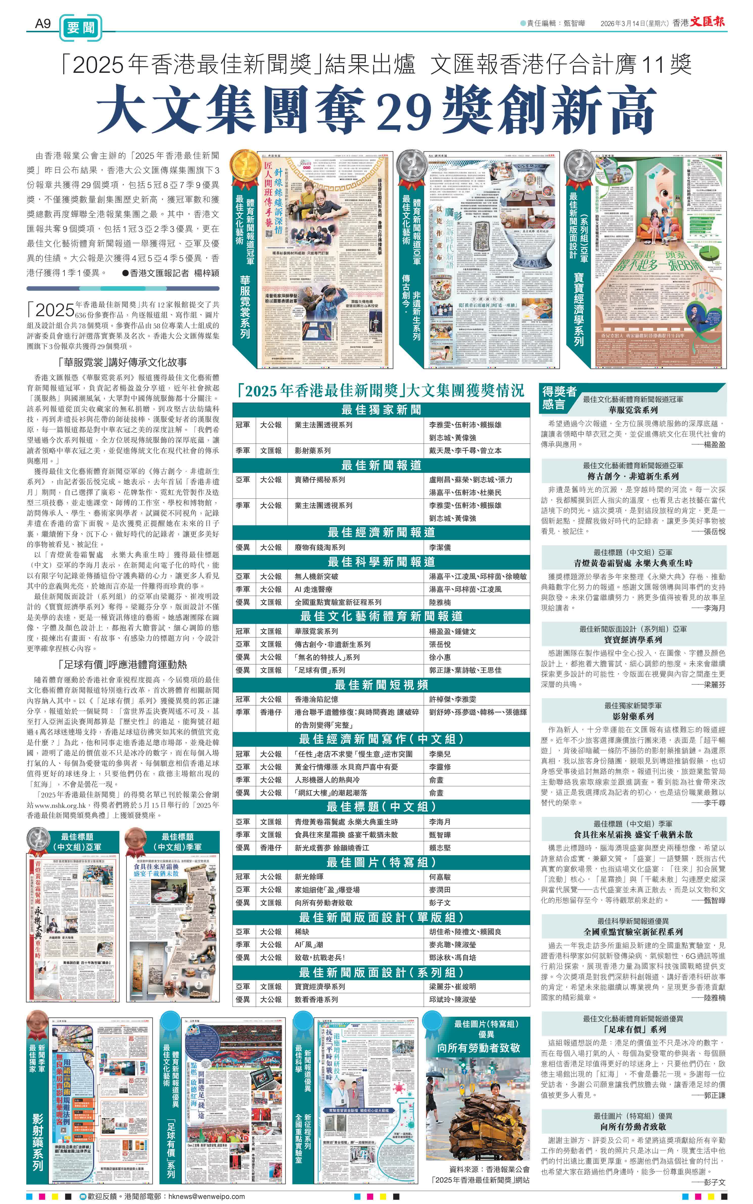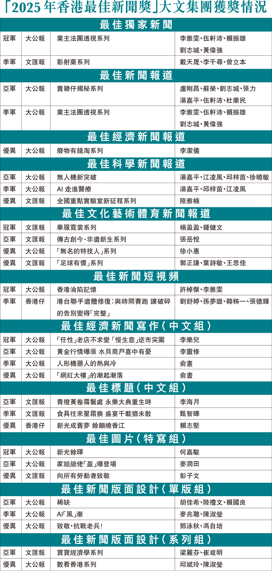 「2025年香港最佳新聞獎」共有12家報館提交了共636份參賽作品,角逐報道組、寫作組、圖片組及設計組合共78個獎項。參賽作品由58位專業人士組成的評審委員會進行評選落實賽果及名次。香港大公文匯傳媒集團旗下3份報章共獲得29個獎項。
