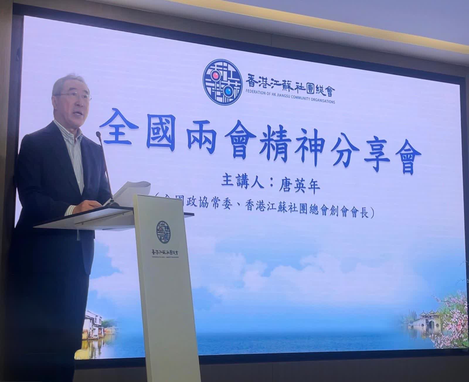 全國政協常委、香港江蘇社團總會創會會長唐英年今日(14日)於香港江蘇社團總會舉辦的2026全國兩會精神分享會上,分享兩會精神,表示香港要主動搶抓「十五五」機遇,並與江蘇深度融合,發揮共同優勢,為國家投入力量,推動新質生產力發展。