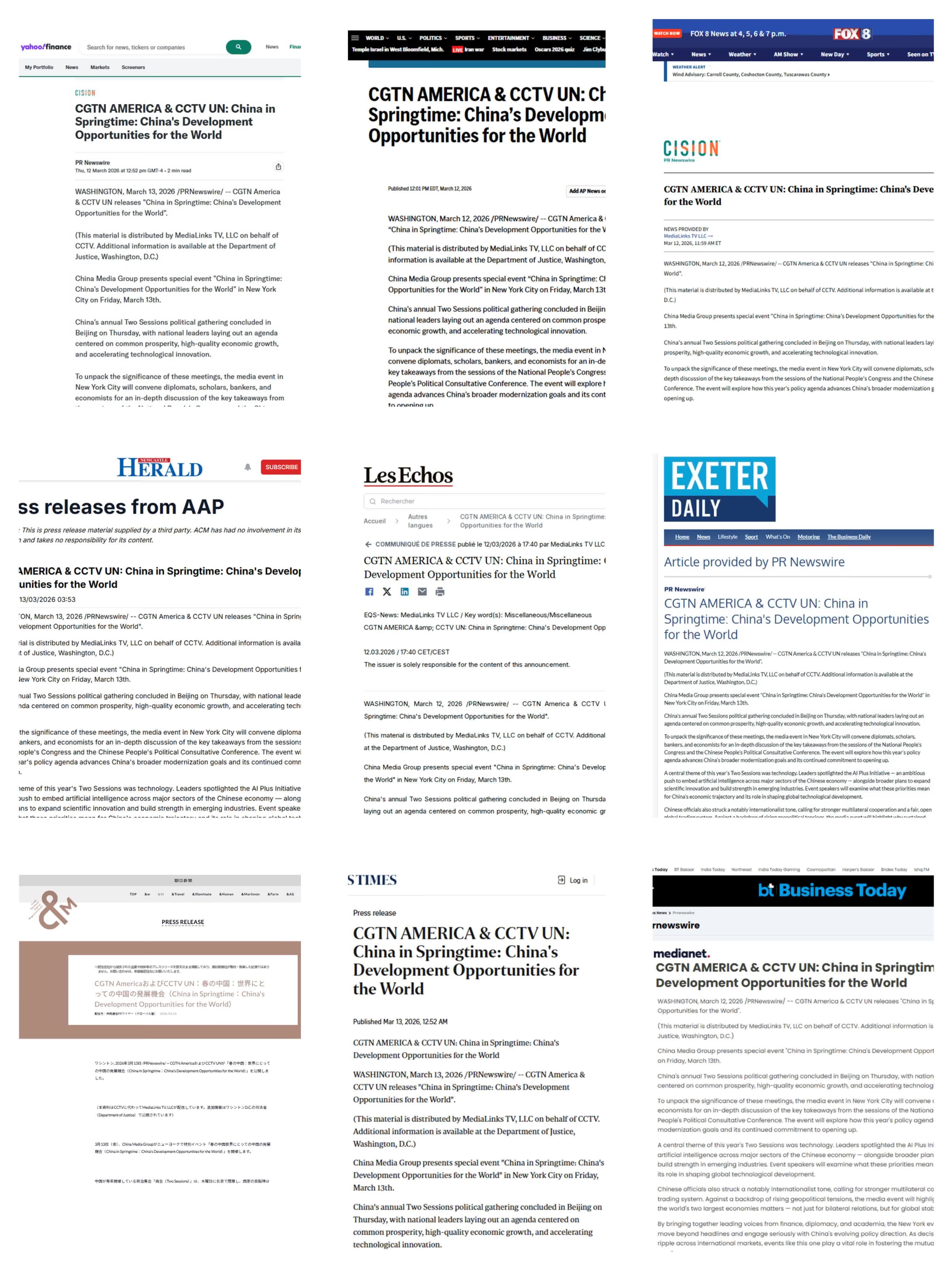 截至當地時間13日,「春天裏的中國」全球對話會美國專場相關報道被美國、英國、加拿大、法國、德國、日本、韓國、新加坡、馬來西亞、印度等61個國家和地區的1458家主流媒體轉載轉發。