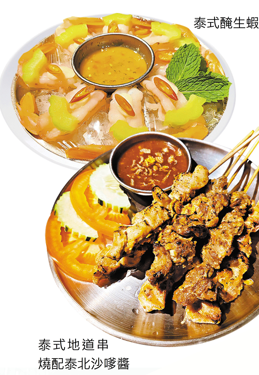 在泰北小吃方面,有「泰式地道串燒配泰北沙嗲醬」,提供豬、牛、雞肉多款選擇。與常見花生醬為基底的沙嗲不同,這裏的醬汁以新鮮大辣椒、蒜頭、乾葱、醋及番茄精心調製,口感清爽微酸,辣度溫和。