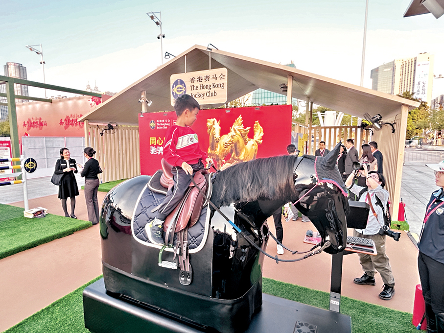 香港賽馬會在現場設置了規模最大的賽馬文化展區,其中馬術井字棋、模擬馬術騎乘體驗等項目深受市民遊客喜愛,其中是馬術騎乘體驗更受到青少年觀眾追捧,小朋友在騎師的指導下玩得認真兼盡興。工作人員介紹,馬會將真實的馬術訓練裝備帶到馬術周現場,並有近10名騎師駐場。