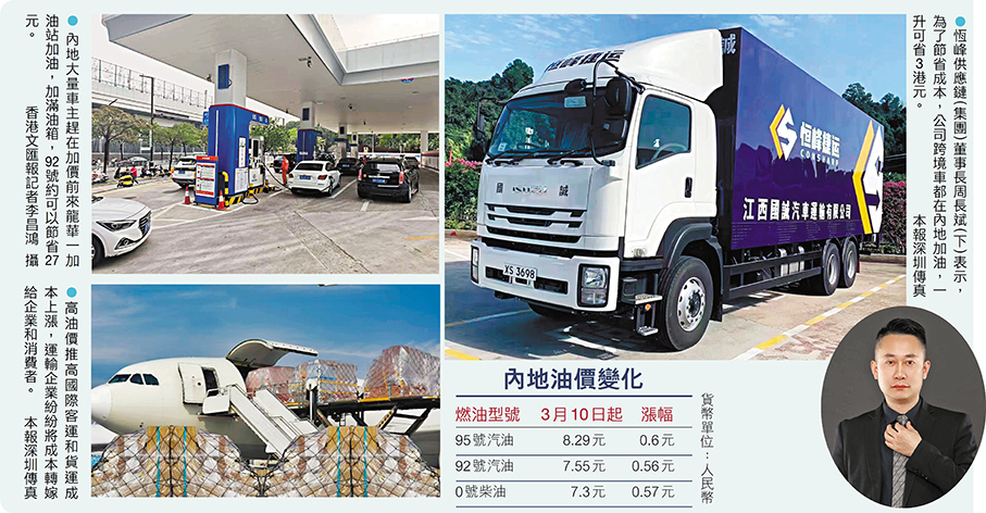 美以伊戰事2月底突然爆發,伊朗不斷還擊,連接波斯灣的霍爾木茲海峽商業運輸近乎停擺,導致國際油價暴漲。紐約原油上周初一度逼近120美元,回落後仍企穩100美元附近水平。受此影響,內地汽油和柴油價格自10日零時起,每噸分別上漲695元(人民幣,下同)和670元,加滿一箱92號汽油,車主多花約27元,為內地四年來最大一次漲幅。市場預計內地油價將在23日晚進行新一輪上調,一升油約上漲1元。油價上漲引發連鎖反應,直接衝擊物流、航空、化工、工農業等行業成本,並波及下游企業和消費者。從事深港跨境物流運輸的企業負責人表示,香港油價已較春節前上漲逾一倍,公司將向出口企業每一車貨加價400元人民幣。