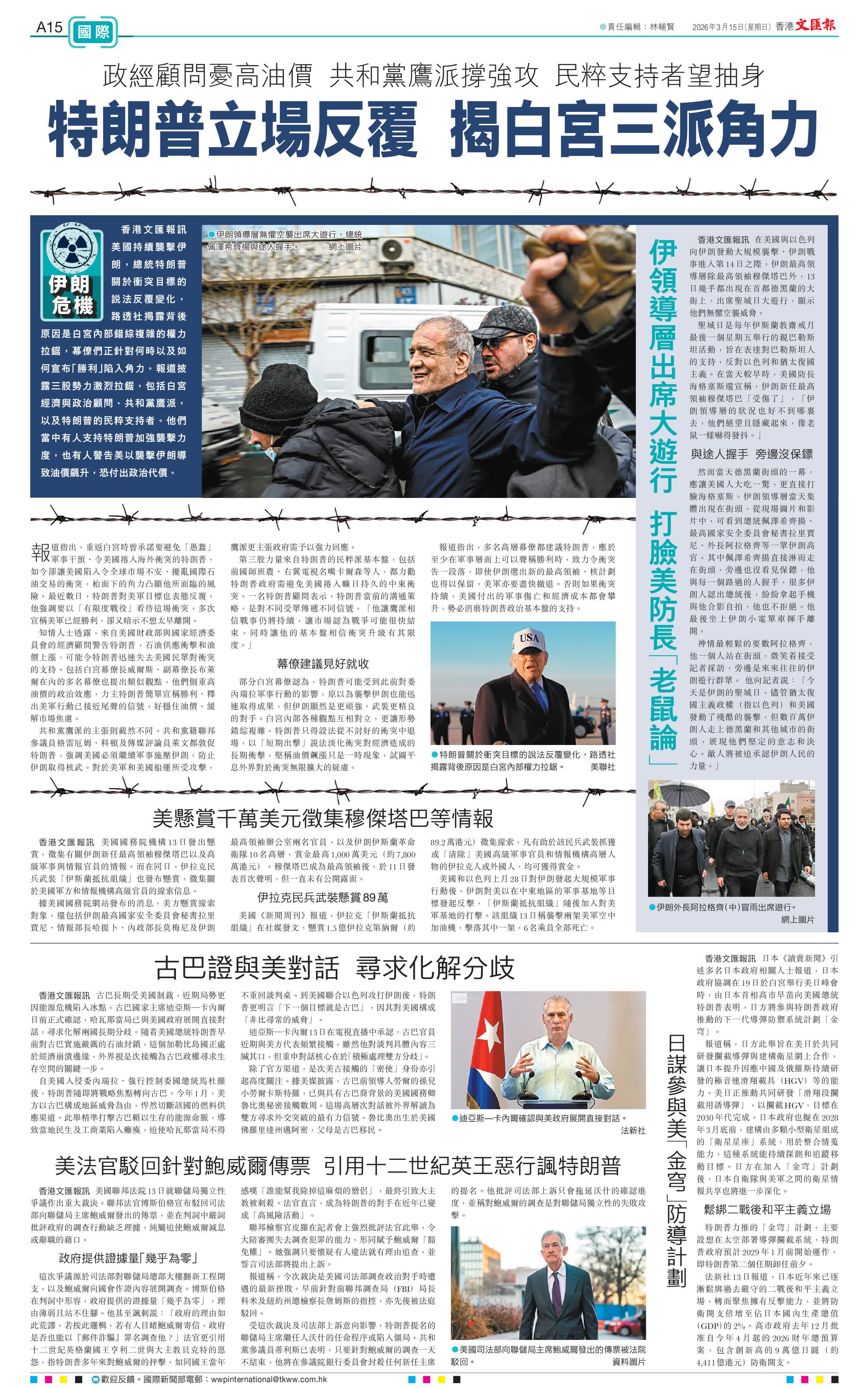 報道指出,重返白宮時曾承諾要避免「愚蠢」軍事干預、令美國捲入海外衝突的特朗普,如今卻讓美國陷入令全球市場不安、擾亂國際石油交易的衝突,枱面下的角力凸顯他所面臨的風險。最近數日,特朗普對美軍目標也表態反覆,他強調要以「有限度戰役」看待這場衝突,多次宣稱美軍已經勝利,卻又暗示不想太早離開。