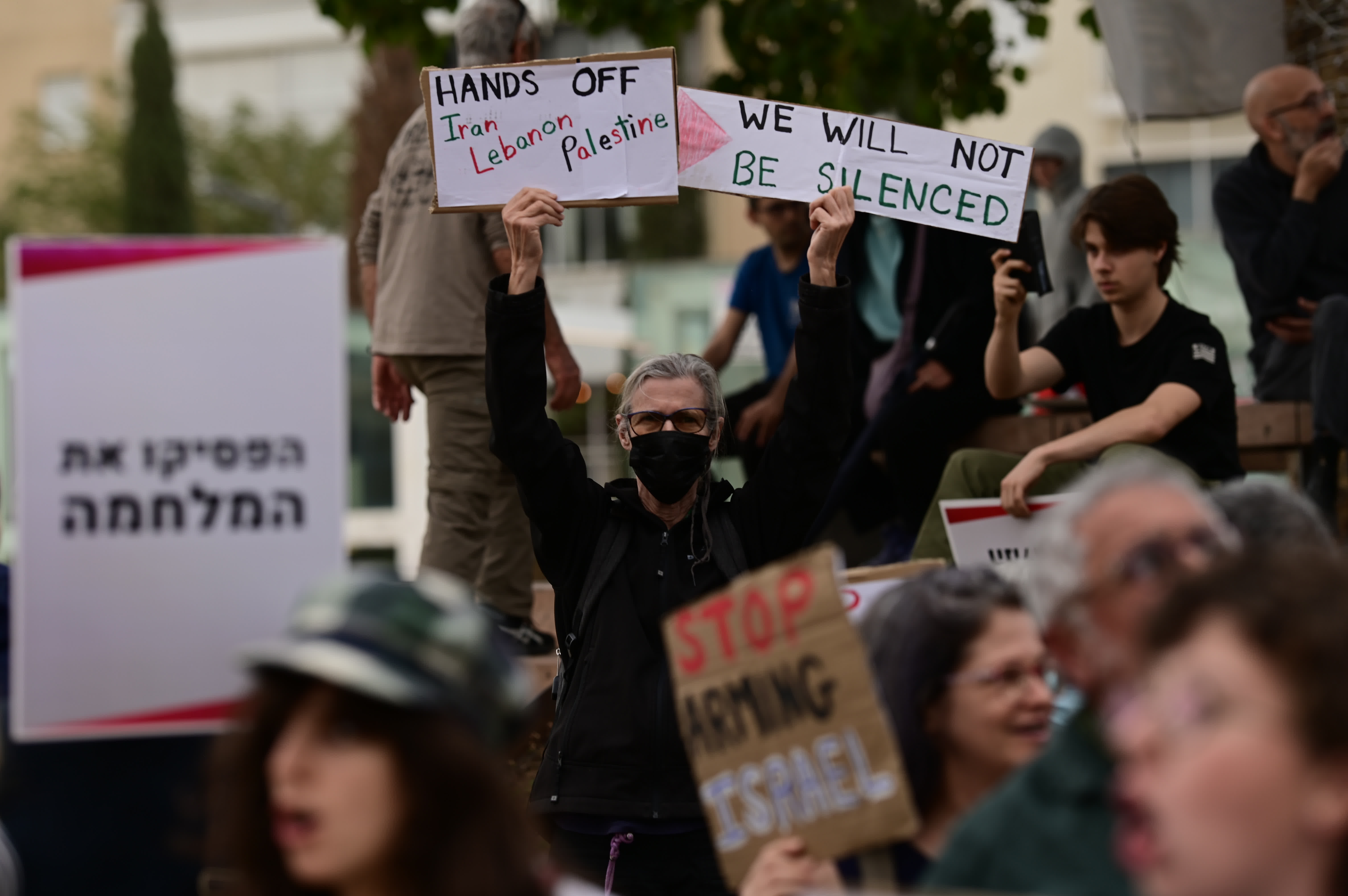 3月14日,人們在特拉維夫一處廣場舉行集會,抗議美國和以色列軍事打擊伊朗,要求美以停止一切戰爭行為。(新華社)