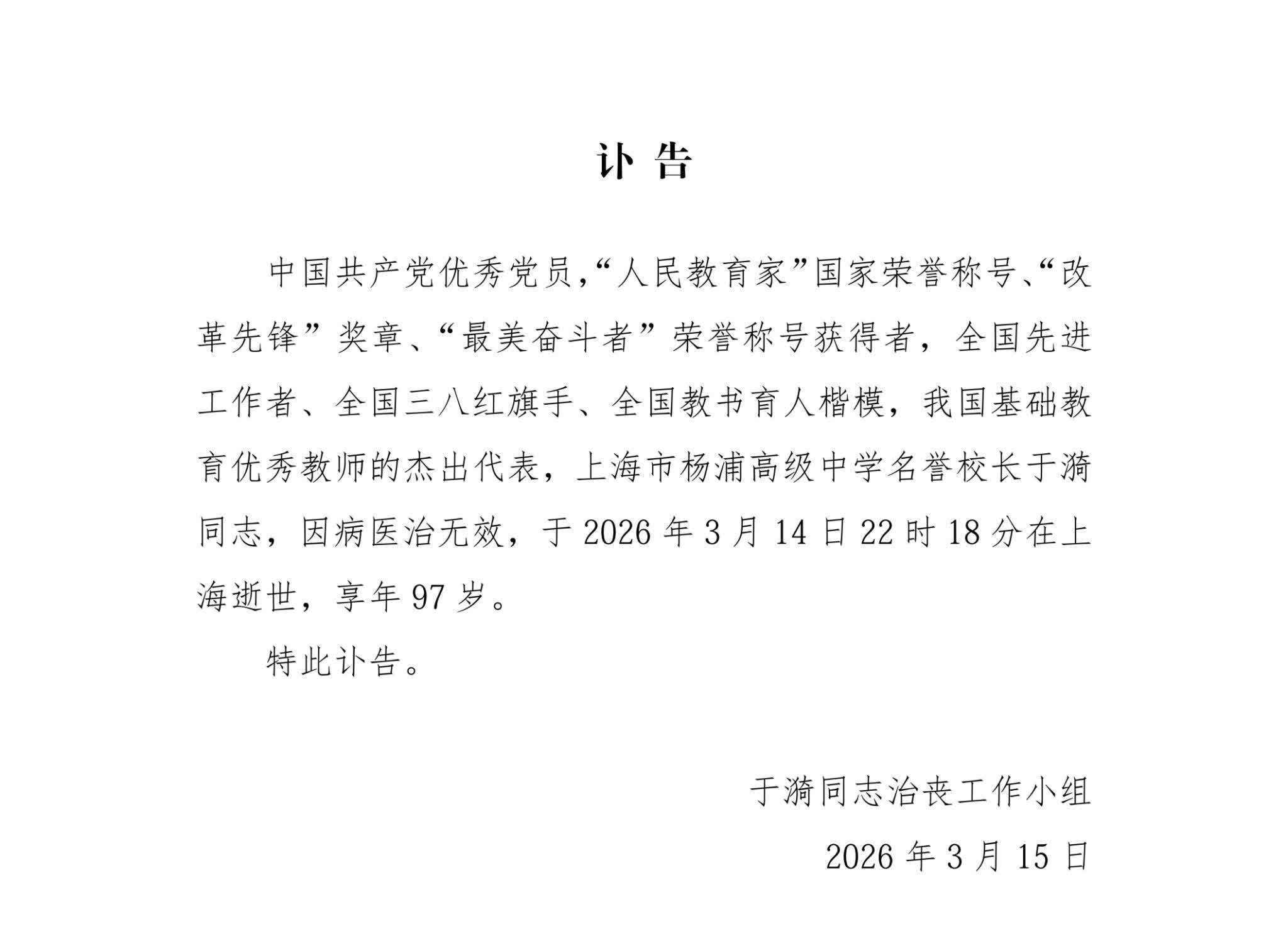中國共產黨優秀黨員,「人民教育家」國家榮譽稱號、「改革先鋒」獎章、「最美奮鬥者」榮譽稱號獲得者,全國先進工作者、全國三八紅旗手、全國教書育人楷模,我國基礎教育優秀教師的傑出代表,上海市楊浦高級中學名譽校長于漪同志,因病醫治無效,於2026年3月14日22時18分在上海逝世,享年97歲。