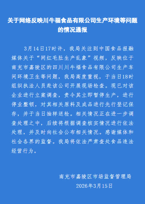 3月14日17時許,我局關注到中國食品報融媒體關於「網紅毛肚生產亂象」視頻,反映位於南充市嘉陵區的四川川牛福食品有限公司生產車間環境衞生等問題,我局高度重視,於當日18時組織執法人員赴該公司開展現場檢查。現已對該企業進行立案調查,責令其立即暫停生產,進行停業整頓,對其相關原料及成品進行先行登記保存,並於當日抽樣送檢。相關情況正在進一步調查處理之中,後續將根據調查核實情況進行依法處理,並及時向社會公布相關情況。