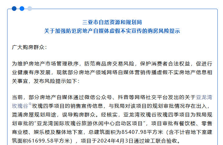 當前,部分房地產自媒體通過微信公眾號、抖音等網絡社交平台發出的關於亞龍灣玫瑰谷玫瑰四季項目的銷售宣傳信息,與三亞市自然資源和規劃局對該項目的規劃審批情況存在出入,混淆房屋規劃用途,誤導購房群眾。經核實,亞龍灣玫瑰谷玫瑰四季項目為三亞市自然資源和規劃局規劃審批的「亞龍灣國際玫瑰谷旅遊休閒中心啟動區項目」,項目審批有餐飲樓、零售商業樓、娛樂樓及整體地下室,總建築面積為85407.98平方米(含不計容地下室建築面積61699.58平方米),項目於2024年4月3日通過竣工聯合驗收。