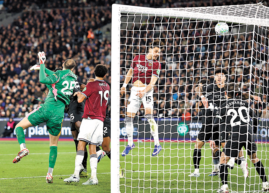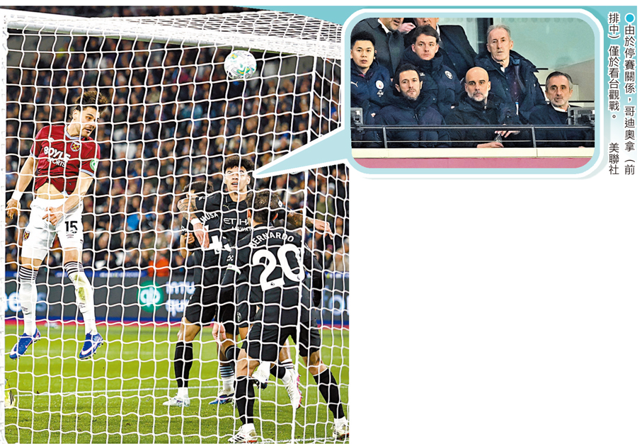 在阿仙奴完成全取三分任務後,曼城於周六尾場比賽作客韋斯咸。剛在上周中歐聯比賽0:3慘負予皇家馬德里的「藍月亮」,雖於上半場31分鐘由貝拿度施華妙射先開紀錄,但球隊僅領先了四分鐘,便被主隊的馬夫洛柏路斯頂入角球扳平,而值得一提的是,這亦是「鎚仔幫」在今場比賽唯一的一次攻門。