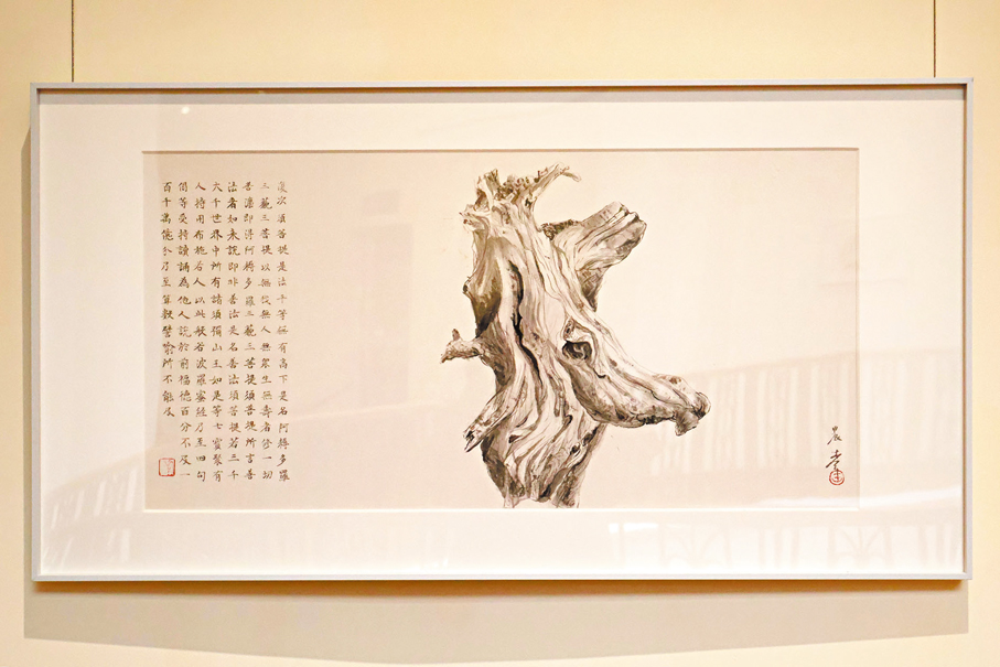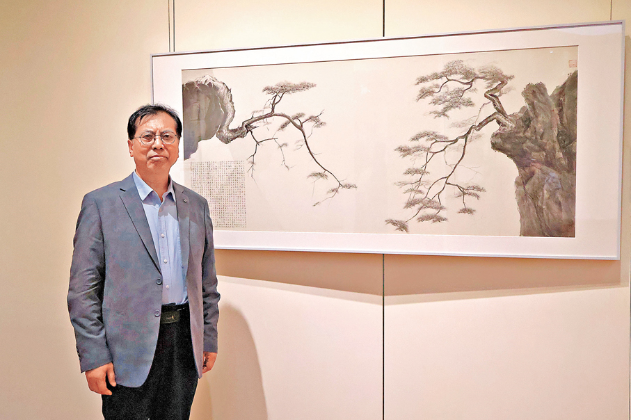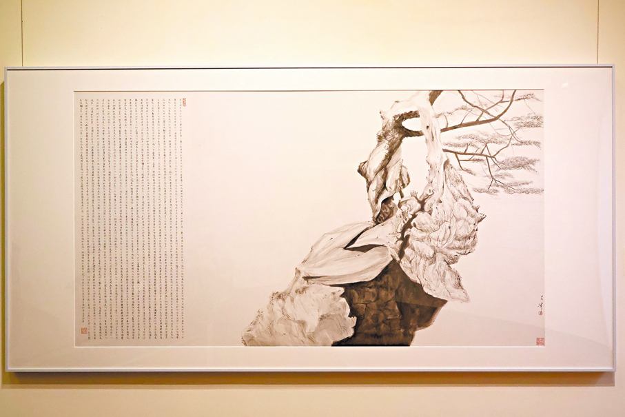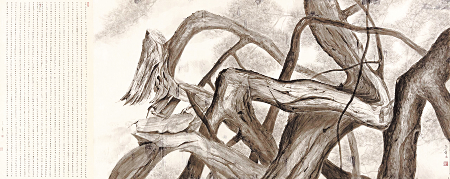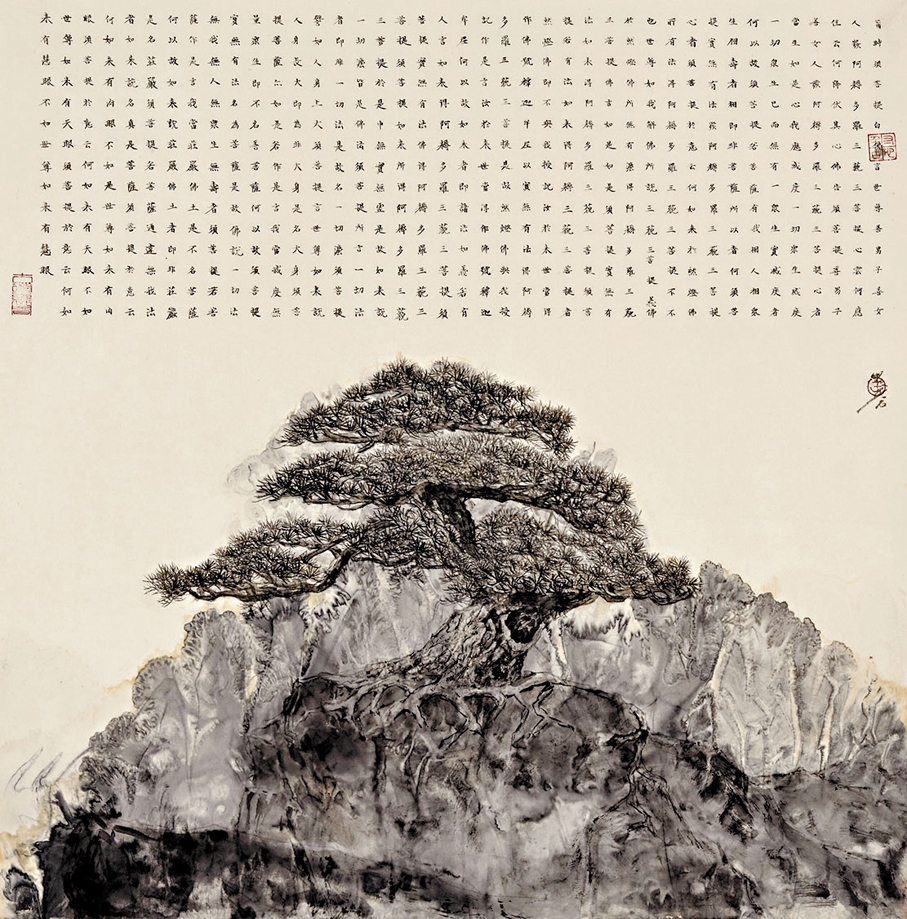 用松煙墨在紙面上呈現松樹遒勁的枝幹,松樹好像實現了涅槃重生。香港大學美術博物館內,各種形態的國畫松樹與《金剛經》經文節選,正靜靜傳達內地書畫家兼篆刻家王新有關中式哲學及意境的感悟。此展覽名為「金剛松影︰王新水墨」,展期直至5月24日。每幅畫作,都是王新與畫面進行心靈交流的結果。