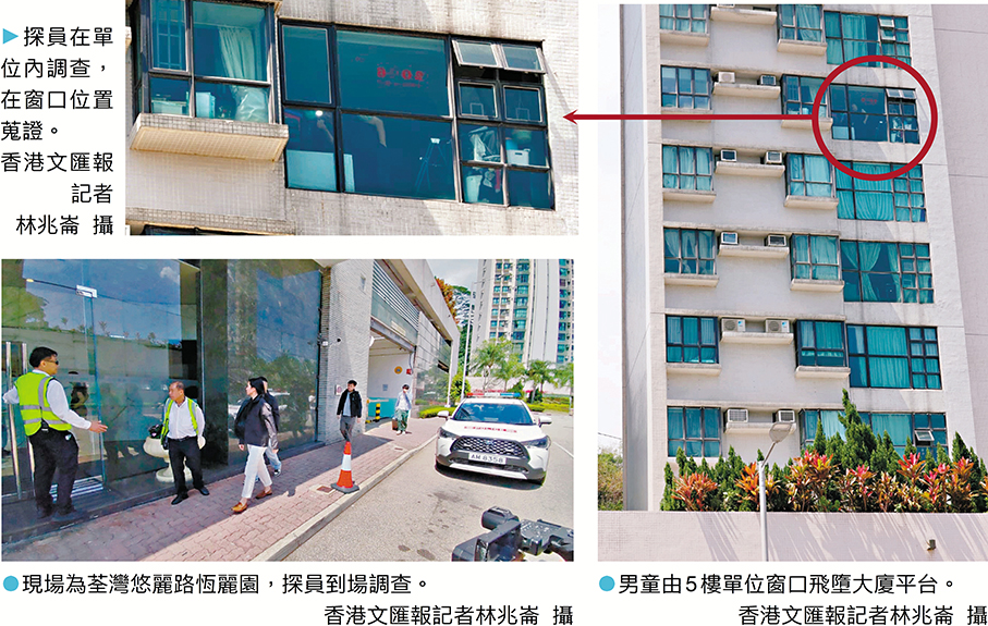荃灣一個私人屋苑昨晨發生涉及男童墮樓死亡的家居意外。一名兩歲男童與兄長在客廳玩耍期間,疑一時百厭攀窗失平衡,飛墮樓下平台重傷昏迷。兄長目睹弟弟墮樓慌忙通知廳內的母親,父親拔足衝往平台把昏迷的兒子送往港安醫院求救,惜搶救無效證實不治。警方事後經調查,發現客廳窗戶並無安裝窗花或上鎖,不排除因此釀成悲劇,遂以涉嫌疏忽照顧兒童罪名將男童的父母拘捕調查。 ●香港文匯報記者 蕭景源