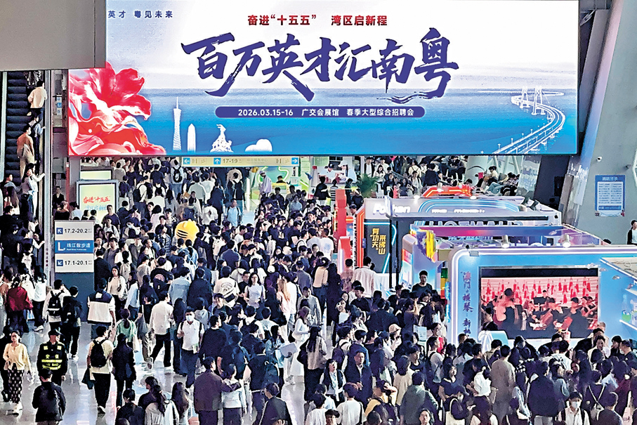 3月15日至16日,「百萬英才匯南粵」2026年春季大型綜合招聘會在廣州舉行,香港文匯報記者留意到,本屆春招中,高薪崗位普遍集中在AI、算法、具身智能等高端科技領域,除前沿科技企業持續熱招外,傳統製造業加速布局智能化轉型的趨勢愈發明顯,大量車企、電子製造企業隨智能業務擴張大規模引才,「產業+AI」成為最突出的人才需求方向。●香港文匯報記者 李紫妍 廣州報道