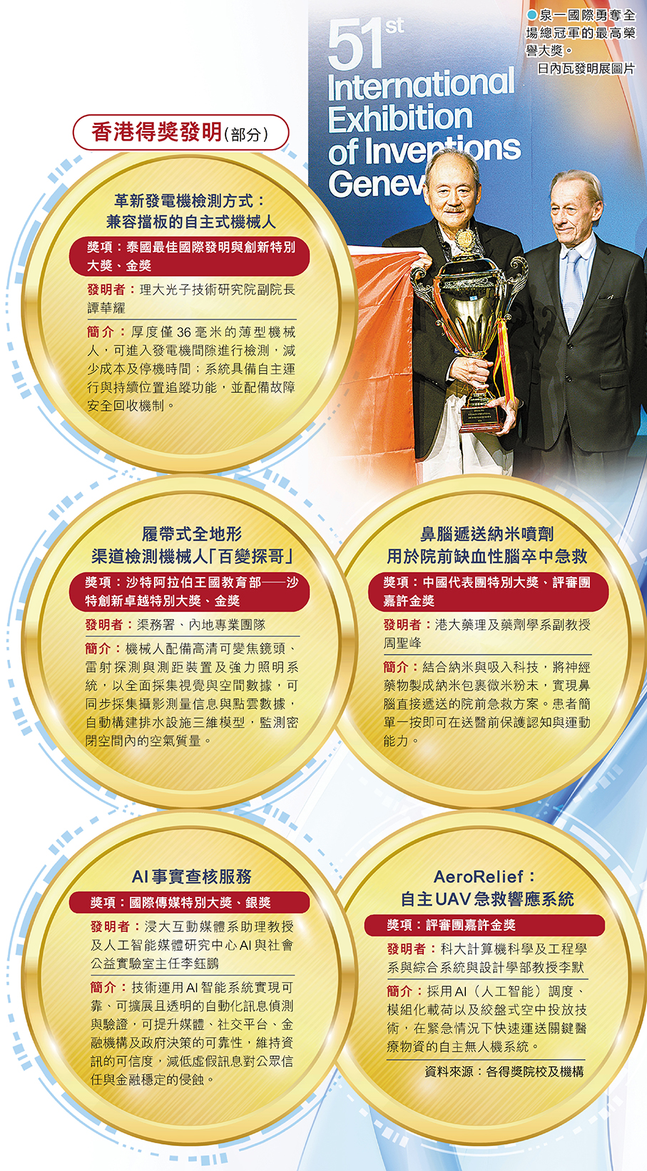國家「十五五」規劃大力支持香港建設國際創科中心,本港創科界亦以卓越表現作出回應。在全球發明界焦點的第五十一屆日內瓦國際發明展,香港代表團再次揚威,創下歷屆最佳成績,本港多所頂尖大學、科企、政府部門、研究機構及中小學共取得近300個獎項,包括破紀錄的12個特別大獎,以及57個評審團嘉許金獎及98個金獎。其中,本地魚類養殖企業泉一國際(Oasis ONE)更藉科技轉型的「熱帶海洋鰭魚養殖產業鏈解決方案」,勇奪全場總冠軍的最高榮譽大獎(GRAND PRIX),進一步見證香港創科從實驗室走向應用,讓本地科技產業成果的影響力獲得國際認可。 ●香港文匯報記者 崔瀅、高鈺