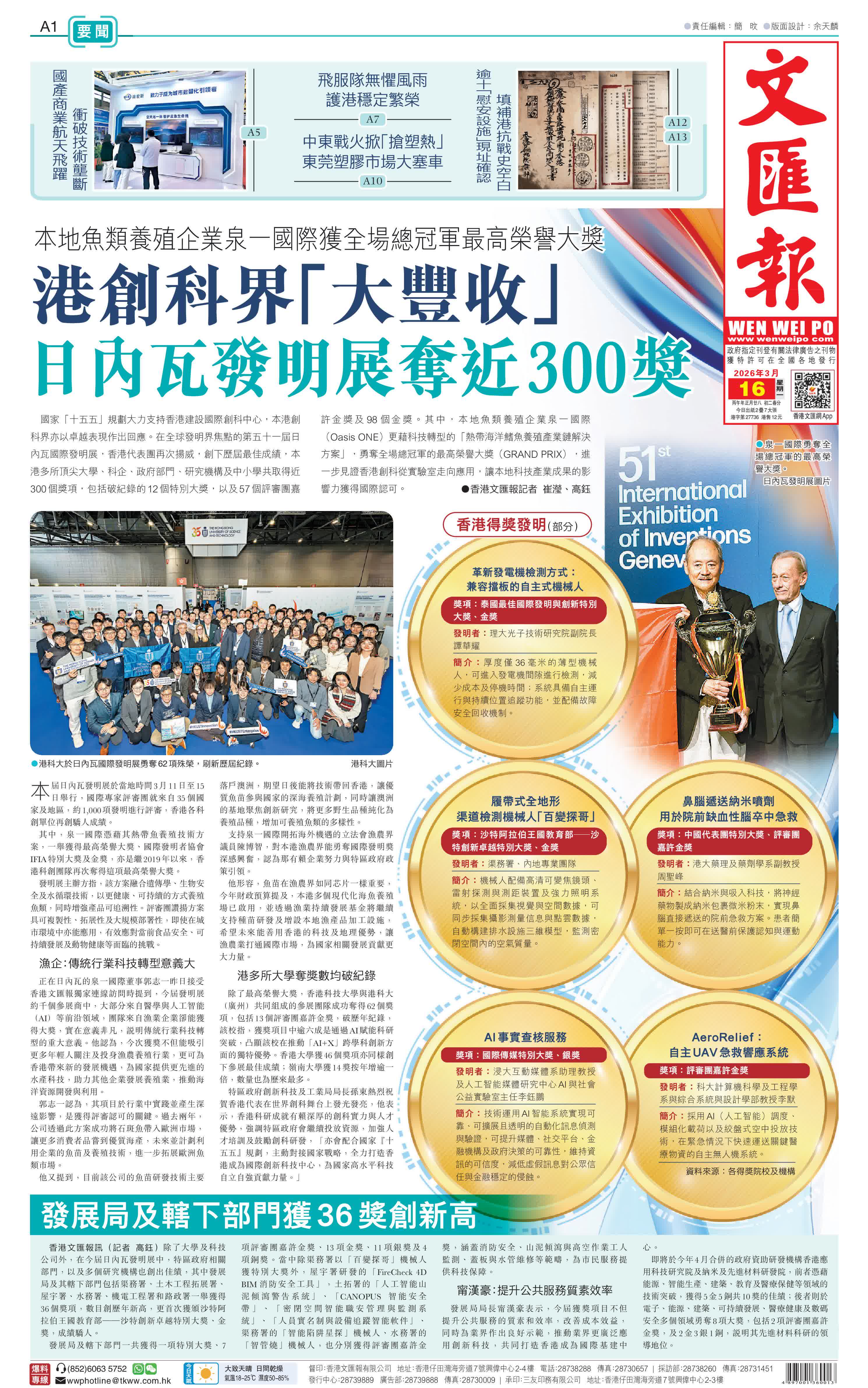 (香港文匯報記者 崔瀅、高鈺)國家「十五五」規劃大力支持香港建設國際創科中心,本港創科界亦以卓越表現作出回應。在全球發明界焦點的第五十一屆日內瓦國際發明展,香港代表團再次揚威,創下歷屆最佳成績,本港多所頂尖大學、科企、政府部門、研究機構及中小學共取得近300個獎項,包括破紀錄的12個特別大獎,以及57個評審團嘉許金獎及98個金獎。其中,本地魚類養殖企業泉一國際(Oasis ONE)更藉科技轉型的「熱帶海洋鰭魚養殖產業鏈解決方案」,勇奪全場總冠軍的最高榮譽大獎(GRAND PRIX),進一步見證香港創科從實驗室走向應用,讓本地科技產業成果的影響力獲得國際認可。