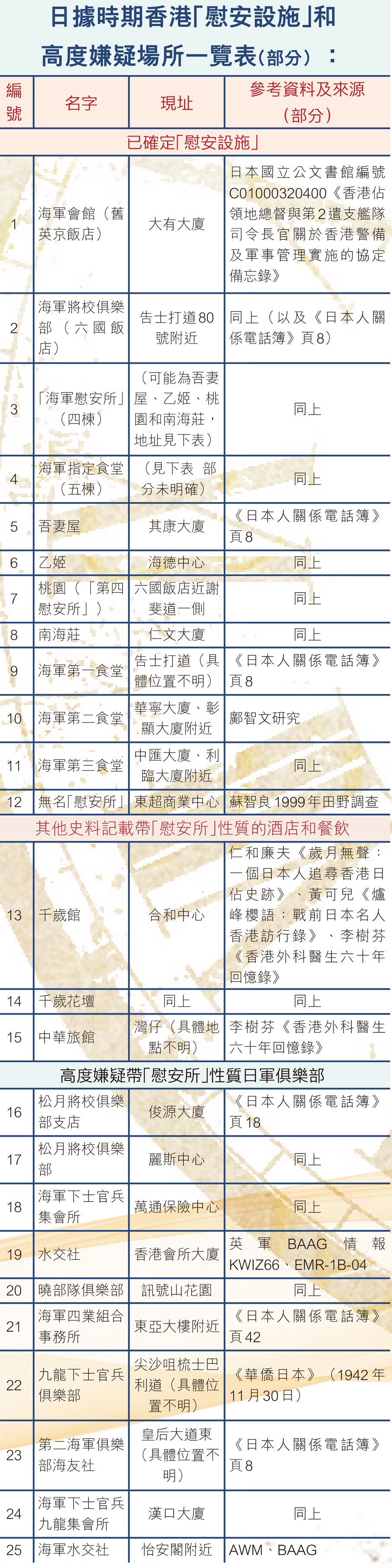 值得注意的是,研究日軍「慰安婦」制度長逾30年的上海師範大學中國「慰安婦」問題研究中心主任蘇智良,早在20多年前亦透過田野調查鎖定一處「慰安所」舊址。加之,李樹芬在回憶錄中所指認的千歲館和千歲花壇,被確定地址的日軍在港「慰安設施」已逾10所。