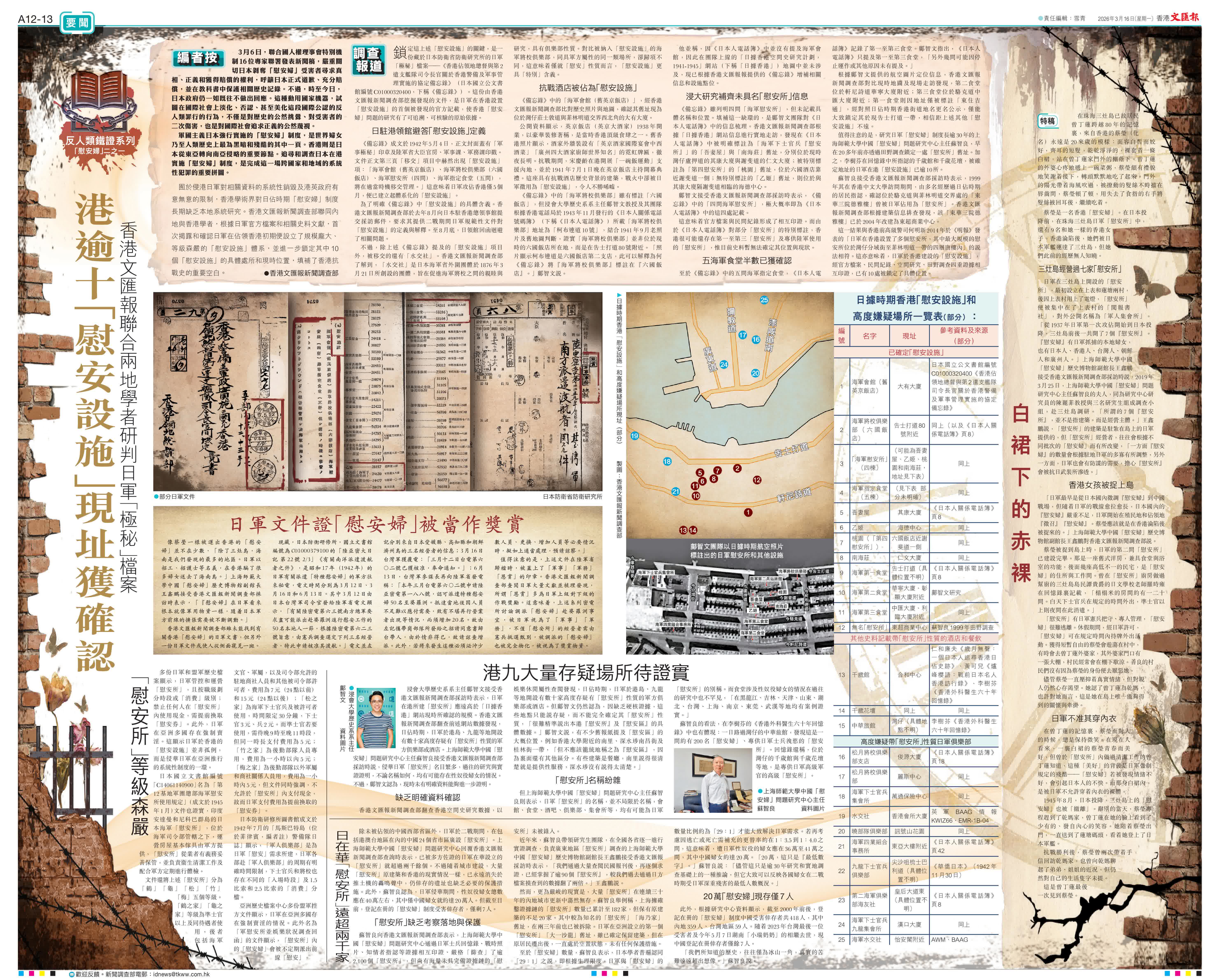 (香港文匯報新聞調查部)囿於侵港日軍對相關資料的系統性銷毀及港英政府有意無意的限制,香港學術界對日佔時期「慰安婦」制度長期缺乏本地系統研究。香港文匯報新聞調查部聯同內地與香港學者,根據日軍官方檔案和相關史料文獻,首次揭露和確認日軍在佔領香港初期便設立了規模龐大、等級森嚴的「慰安設施」體系,並進一步鎖定其中10個「慰安設施」的具體處所和現時位置,填補了香港抗戰史的重要空白。