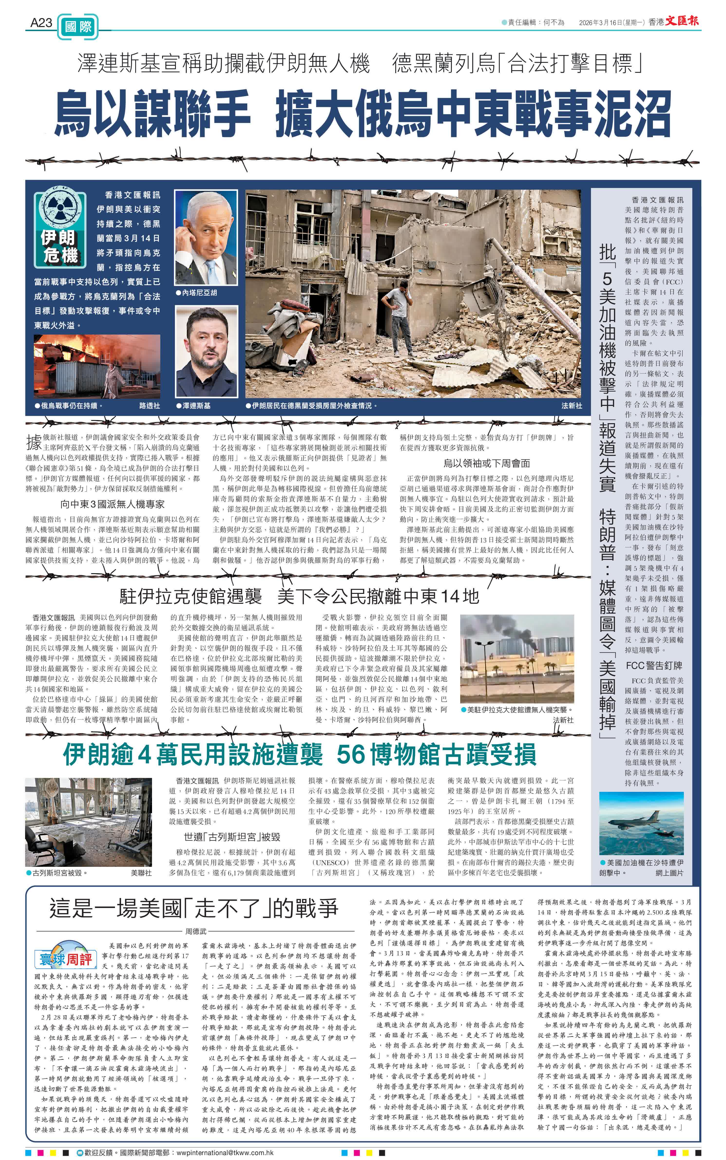 香港文匯報訊 伊朗與美以衝突持續之際,德黑蘭當局3月14日將矛頭指向烏克蘭,指控烏方在當前戰事中支持以色列,實質上已成為參戰方,將烏克蘭列為「合法目標」發動攻擊報復,事件或令中東戰火外溢。